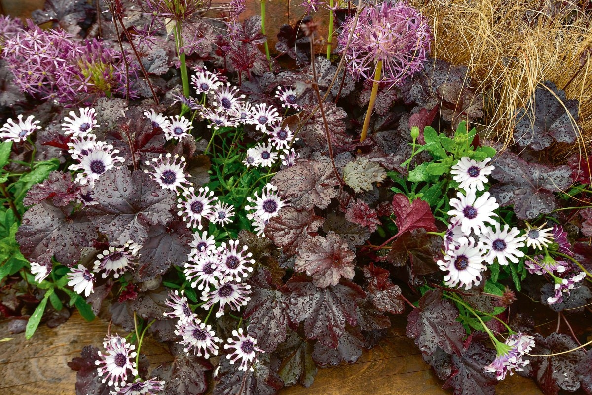 Ciemne rośliny najlepiej prezentują się jako kontrastowy akcent. Zamiast tworzyć rabaty wyłącznie w czerni, warto łączyć je z jaśniejszymi kolorami.