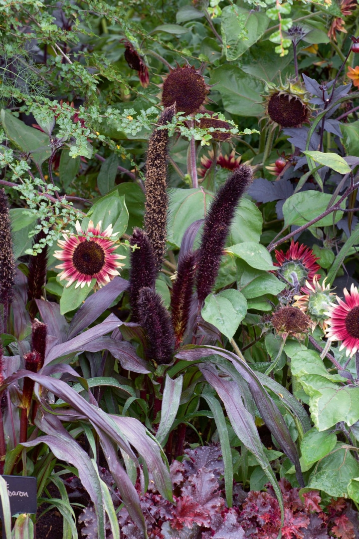 W aranżacjach ogrodowych warto wykorzystać odmiany o ciemnych liściach i kwiatach, takie jak: