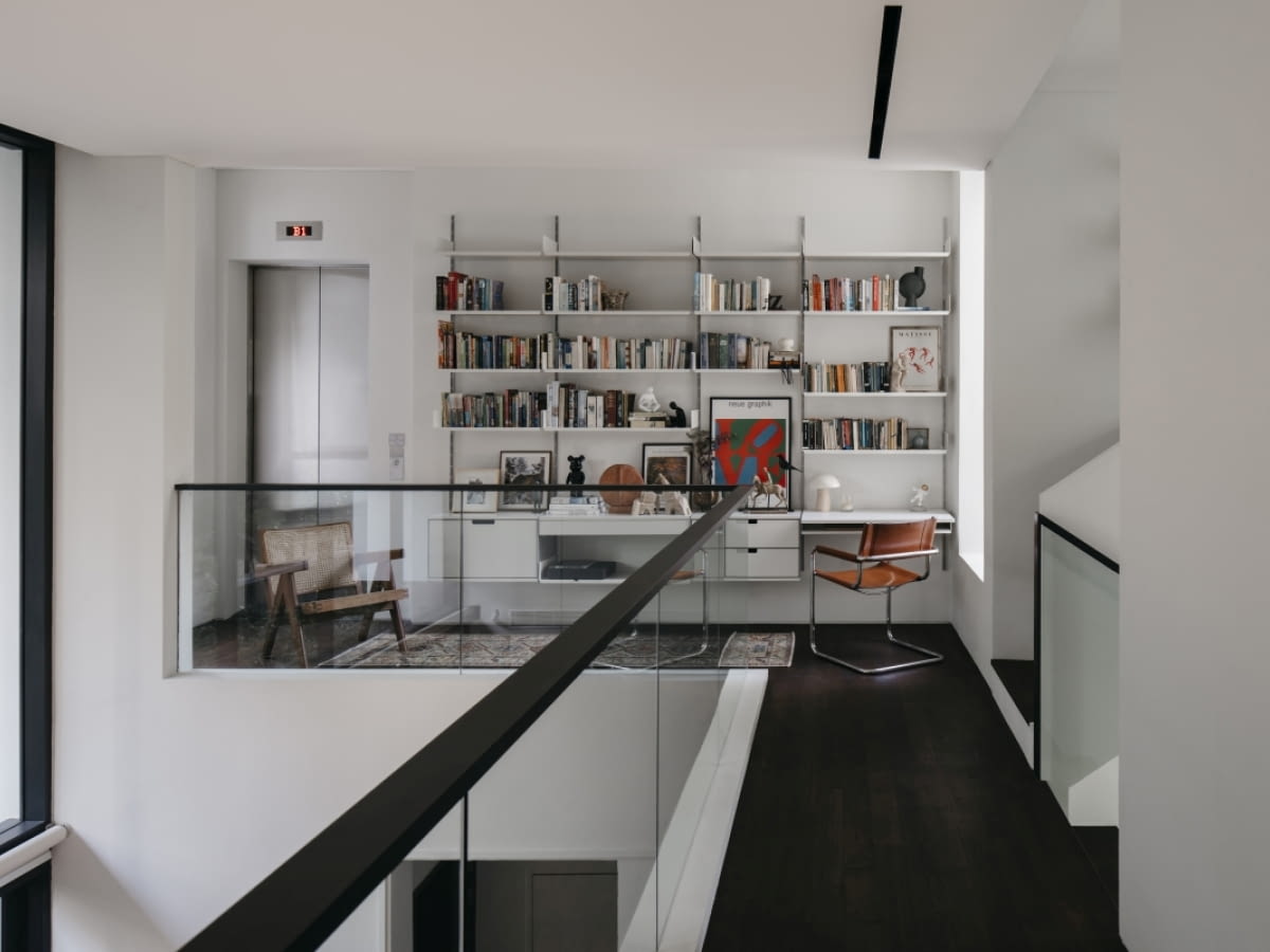 Drugie piętro, mieszczące bibliotekę i gabinet, zostało celowo włączone w ten dialog. Otwarta relacja z salonem poniżej umożliwia stały kontakt wizualny i dźwiękowy pomiędzy kondygnacjami. Układ mebli – zarówno we wnętrzu, jak i na patio – sprzyja rozmowie i współobecności, niezależnie od tego, gdzie aktualnie znajdują się domownicy. Przestrzeń wspiera wspólne bycie, bez wymuszania jednego scenariusza użytkowania.