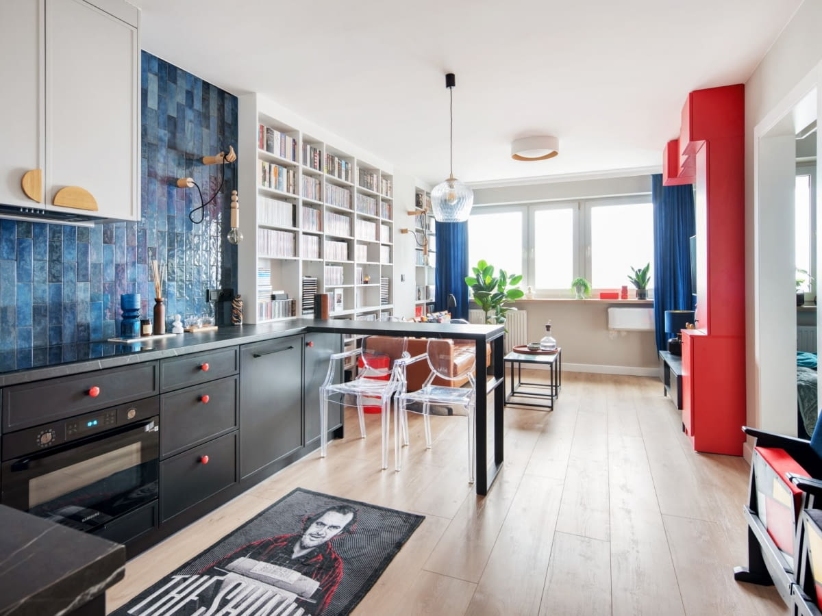 Kolor w tym mieszkaniu gra główną rolę. Nasycone czerwienie, elektryzujące błękity i głęboka czerń tworzą paletę pełną emocji, kontrastów i pasji – niczym w filmach mistrza hiszpańskiego kina.