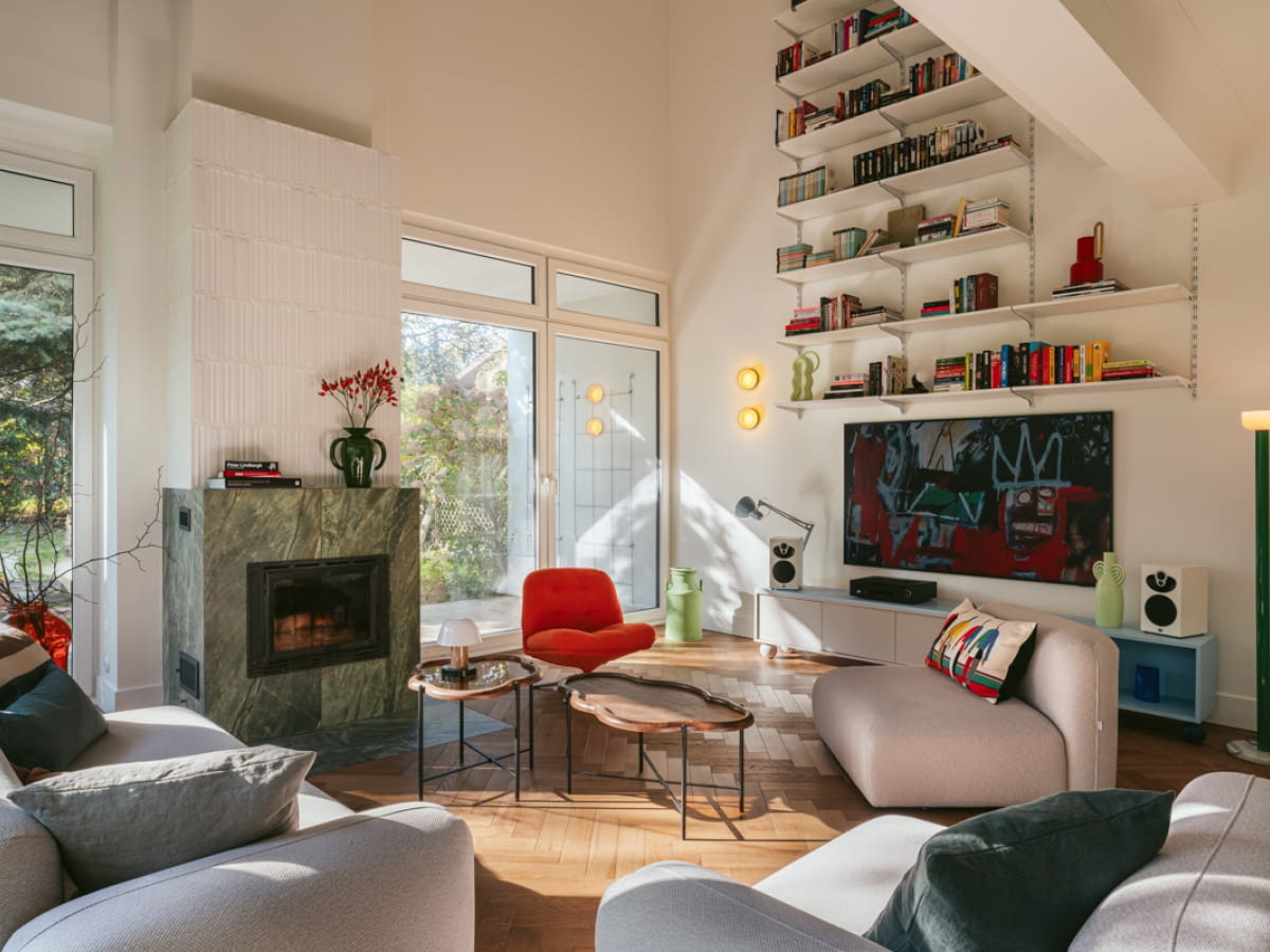 Salon, otwarty aż po kalenicę, wzmacnia poczucie przestronności. Zabudowa z półkami na książki, sięgająca sufitu, odpowiada na konkretną potrzebę funkcjonalną. Całość nie opiera się na efekciarskich rozwiązaniach – jej siła wynika z precyzyjnego dopasowania do wymagań użytkowników.