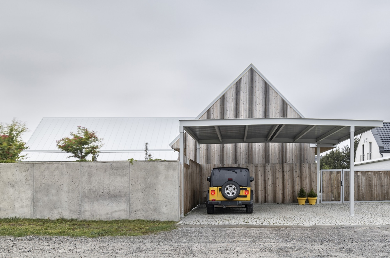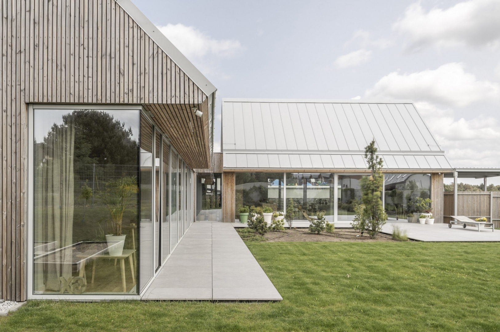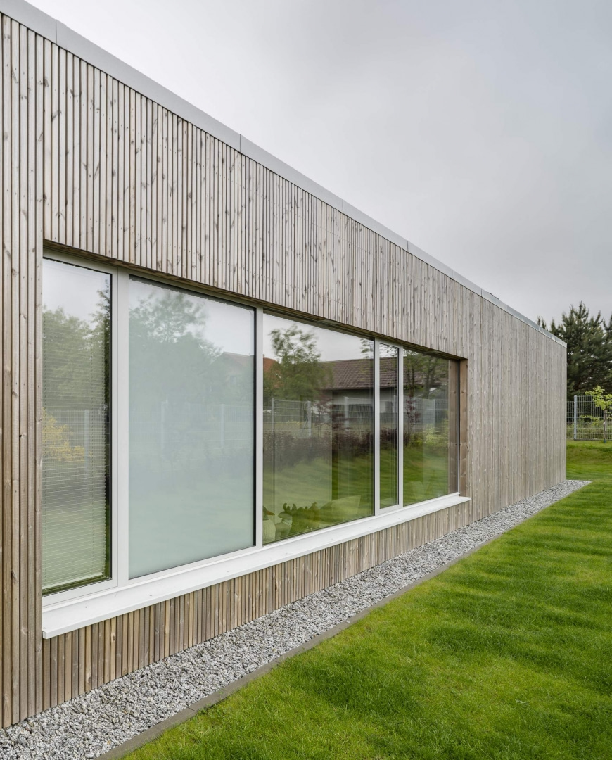 – Na to zadanie odpowiedzieliśmy prostą i ponadczasową formą – tłumaczy główny architekt, Piotr Kowalczyk. – Przetworzyliśmy ją w nowoczesny, uporządkowany układ dwóch prostopadłych brył ułożonych w kształcie litery L. W minimalistycznym łączniku ukryliśmy wejście. Całe założenie otoczyliśmy zielonym dziedzińcem z tarasem, który od strony ulicy chroniony jest surowym, betonowym murem – dodaje architekt.