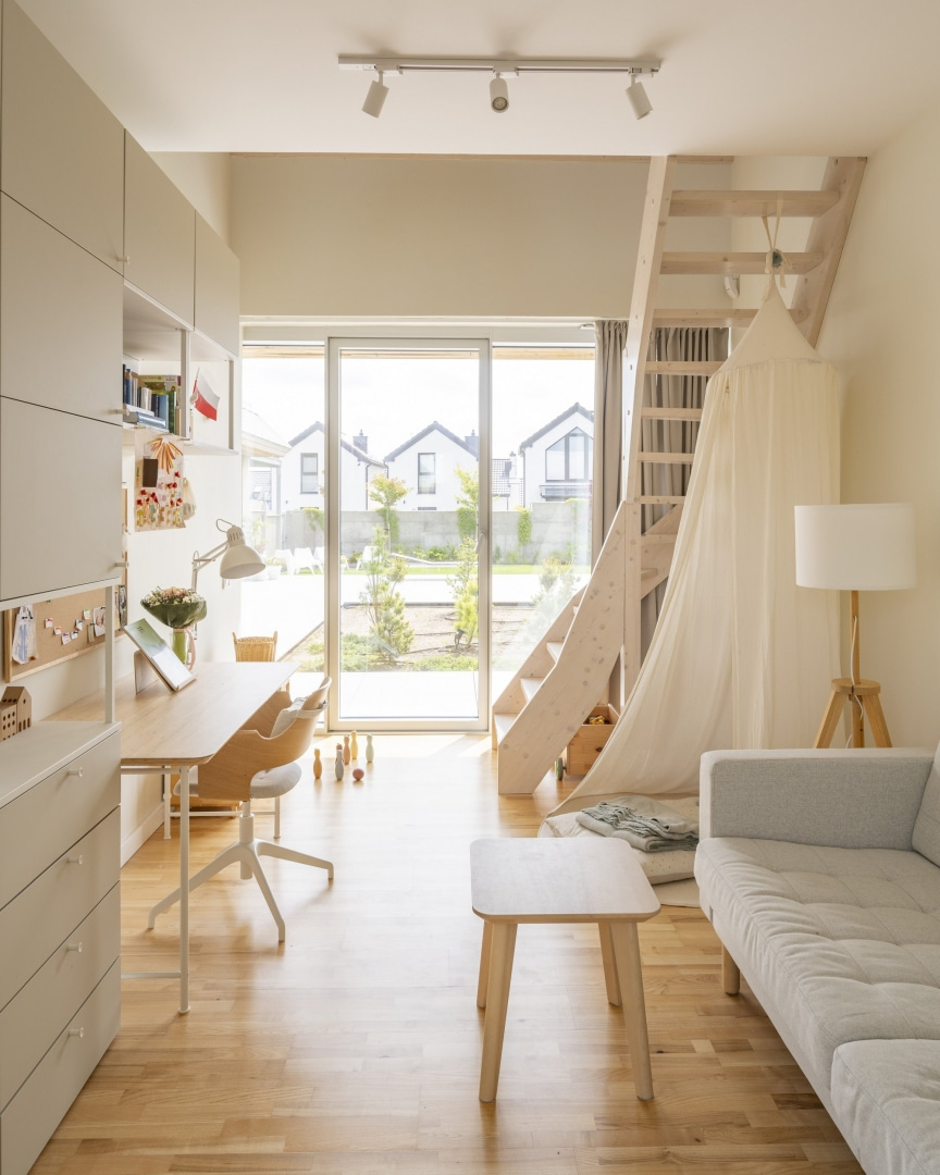 Sercem domu jest przestronna strefa dzienna złożona z kuchni, jadalni i salonu, z wysokim, otwartym sufitem. To tam koncentruje się życie rodzinne. W drugim skrzydle zaprojektowano rozmieszczone szeregowo sypialnie. Te dziecięce wyposażono w antresole, wykorzystując dodatkową przestrzeń pod dachem. Z kolei główna sypialnia, podobnie jak strefa dzienna, posiada w pełni otwartą przestrzeń pod kalenicą.