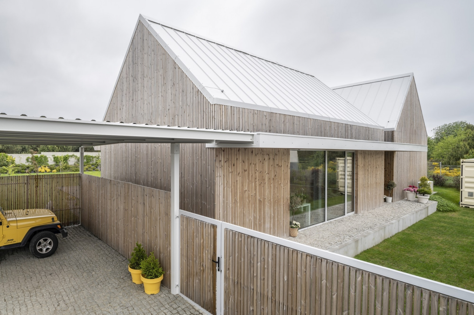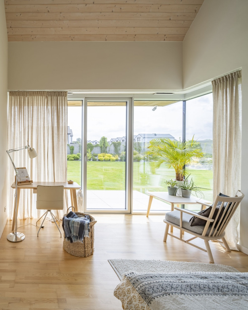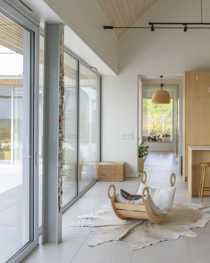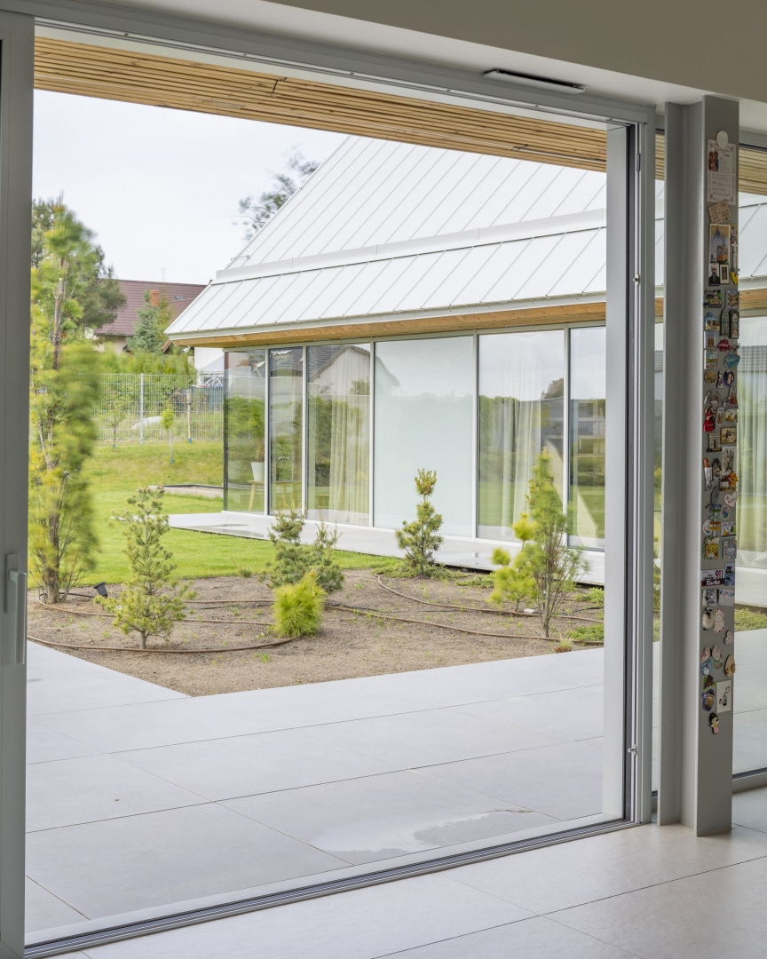 Od strony dziedzińca dom otwiera się pełnymi przeszkleniami na południe i zachód. Duże witryny doprowadzają naturalne światło do wnętrz i zacierają granicę między domem a ogrodem. Każda sypialnia ma własne wyjście na zieleń, a części wspólne płynnie łączą się z tarasem. Delikatny, rzeźbiarski podcień biegnący wzdłuż fasady osłania wnętrza przed słońcem i subtelnie podkreśla geometrię budynku.