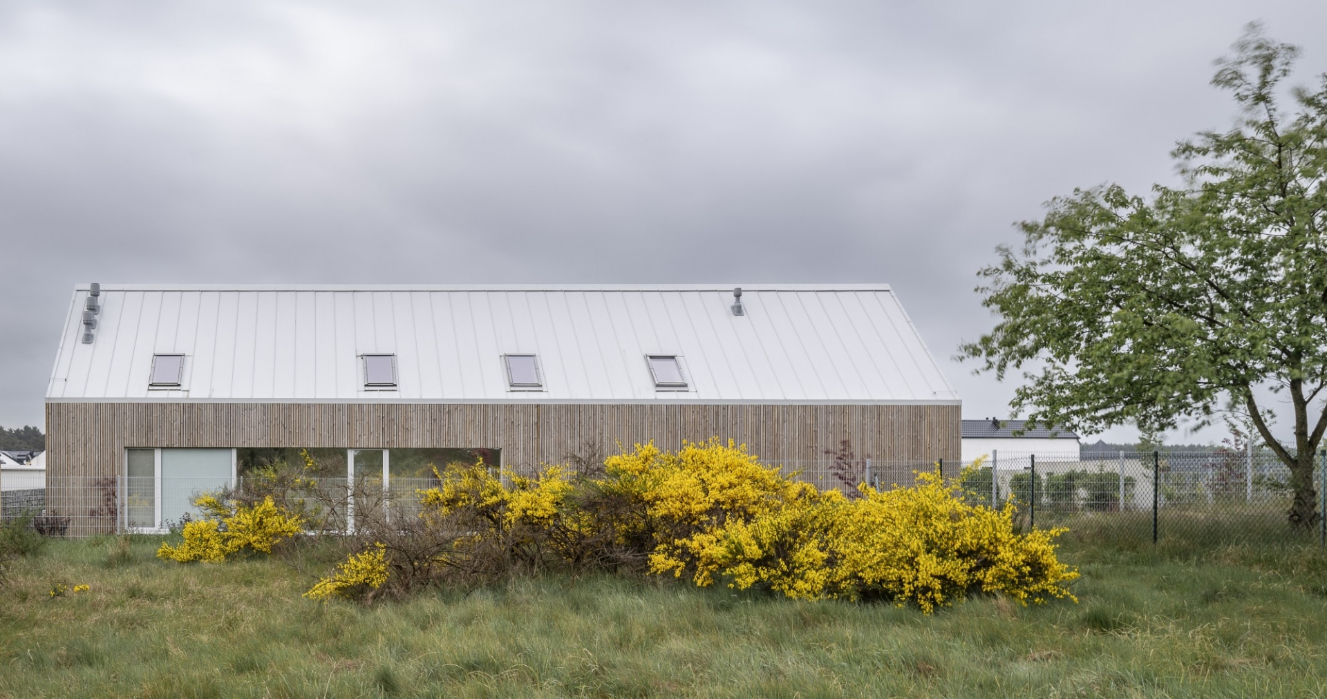 Właściciele – sześcioosobowa rodzina, która przeniosła się ze Śląska na północ Polski – marzyli o parterowym, funkcjonalnym i jasnym domu, w którym życie toczy się w rytmie natury. Działka, położona na granicy lasu i otwartego krajobrazu, sama narzucała ton projektu: architektura miała się w nią wpisać, a nie próbować nad nią dominować.