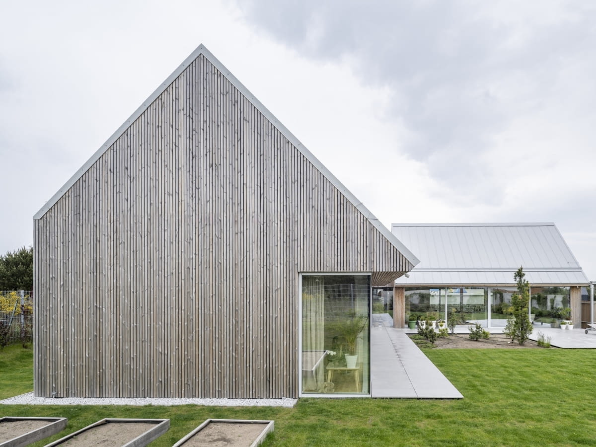 Właściciele – sześcioosobowa rodzina, która przeniosła się ze Śląska na północ Polski – marzyli o parterowym, funkcjonalnym i jasnym domu, w którym życie toczy się w rytmie natury. Działka, położona na granicy lasu i otwartego krajobrazu, sama narzucała ton projektu: architektura miała się w nią wpisać, a nie próbować nad nią dominować.