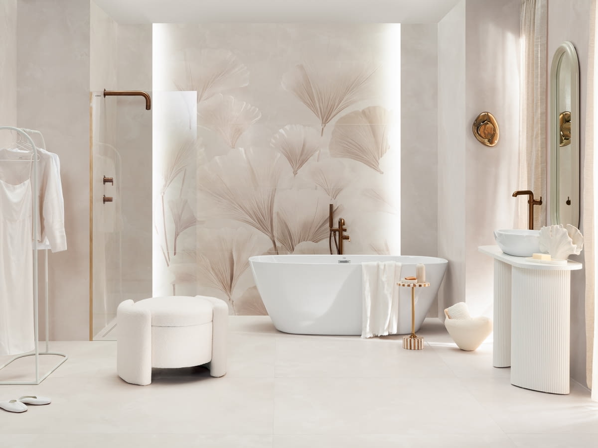 Aby przełamać jasne płaszczyzny, projektanci wzbogacili kolekcję o subtelny, tapetowy dekor inspirowany liśćmi japońskiego miłorzębu. Delikatny, niemal rzemieślniczy rysunek roślinny wprowadza do wnętrza organiczną fakturę i naturalny rytm. Ten motyw ociepla przestrzeń, nadaje jej przytulności i sprawia, że minimalistyczna estetyka staje się bliska codziennemu doświadczeniu. Połączenie gładkich, świetlistych powierzchni z botanicznym akcentem buduje równowagę pomiędzy nowoczesnością a naturą.