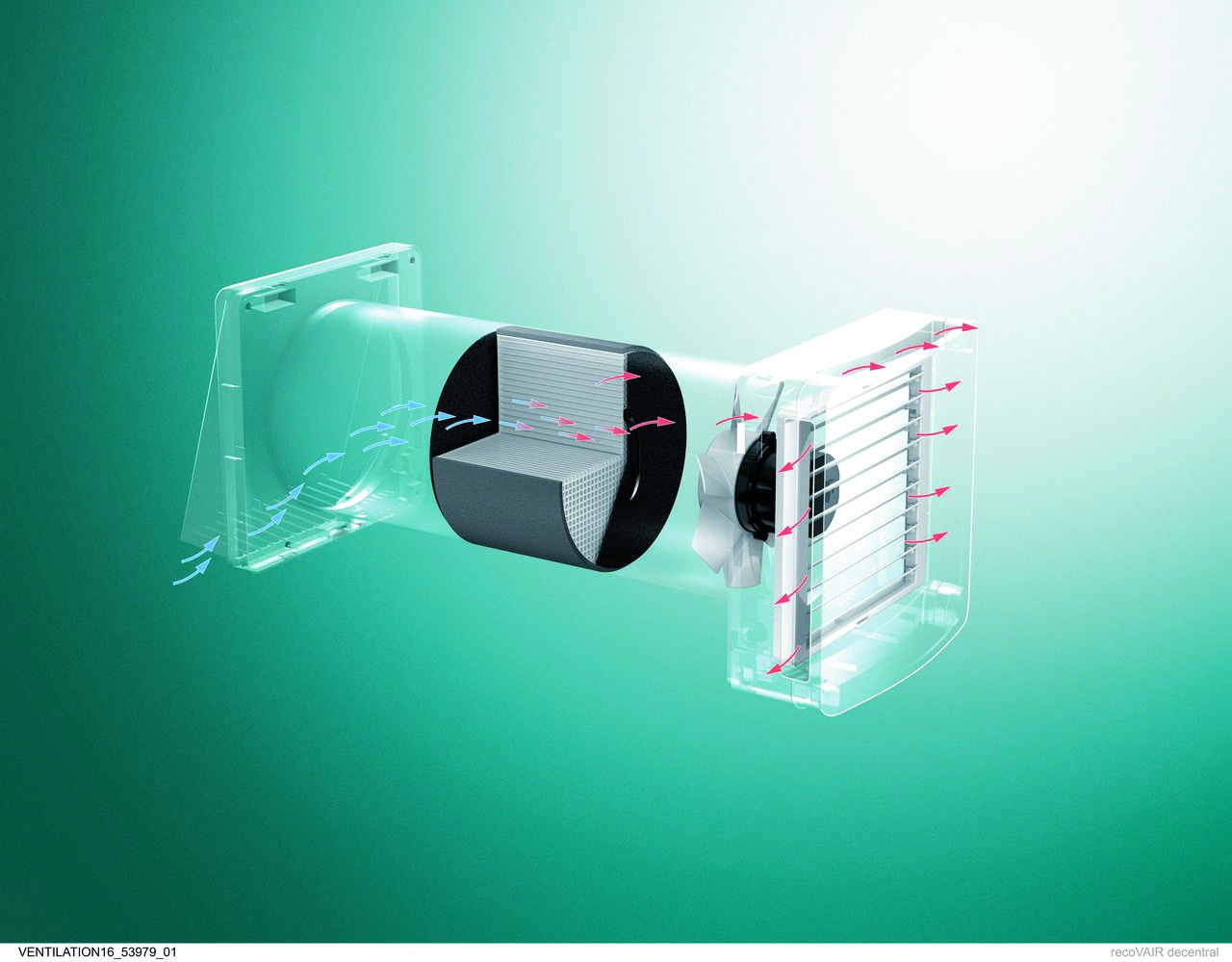 Jak działa wentylacja decentralnej? Zamiast jednej centrali wentylacyjnej i sieci kanałów, montujemy pojedyncze urządzenia w ścianach zewnętrznych pomieszczeń, które chcemy wentylować. Wymiana powietrza odbywa się sekwencyjnie. Najpierw urządzenie usuwa powietrze przez np. 60 sekund odbierając z niego energię, aby następnie przełączyć się w drugą stronę i przez kolejne 60 sekund oddawać ją do powietrza nawiewanego.