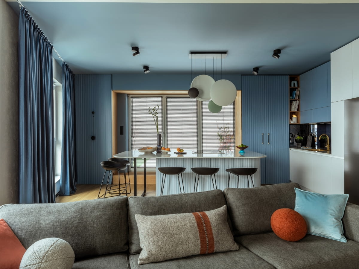 - wysoka zabudowa z piekarnikiem i lodówką, ustawiona na styku kuchni i salonu, formująca rodzaj „tła” dla części wypoczynkowej,