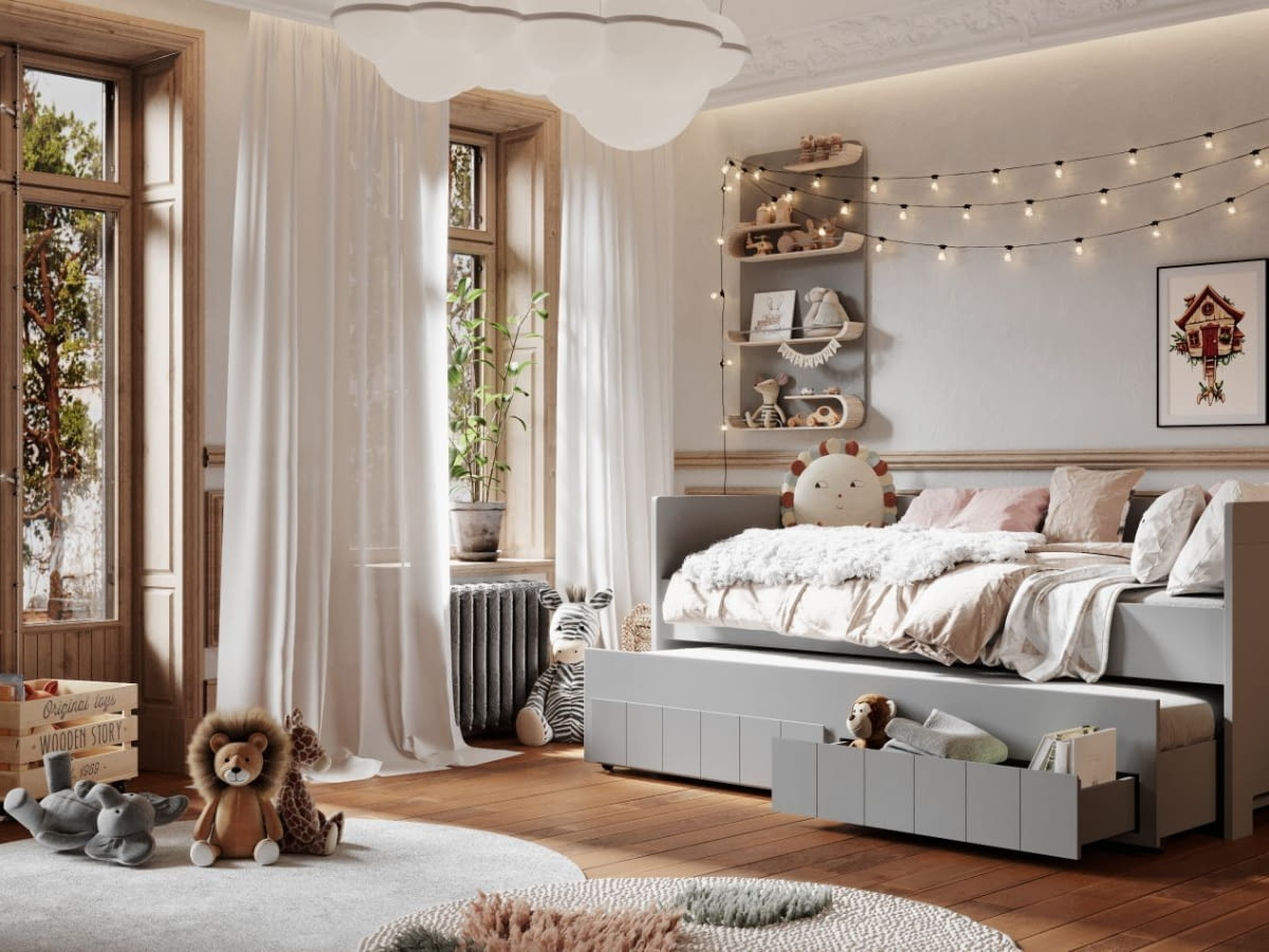 Strefa snu w dużym pokoju może być bardziej odseparowana, co sprzyja wyciszeniu. Ustawienie łóżka z dala od wejścia i od części zabawowej ogranicza wrażenie „ciągłej aktywności”. Pomocne bywają miękkie tekstylia: zasłony, dywan, narzuta i poduszki, które poprawiają akustykę oraz ocieplają wizualnie przestrzeń. Jeśli pokój jest bardzo duży, sprawdzi się także pomysł na przytulny zakątek: łóżko z baldachimem, wnęka z półkami albo ustawienie regału tak, by tworzył spokojniejszą część pomieszczenia. Dzięki temu łatwiej utrzymać rytm dnia, a obszar odpoczynku kojarzy się z ciszą, a nie z magazynem zabawek.