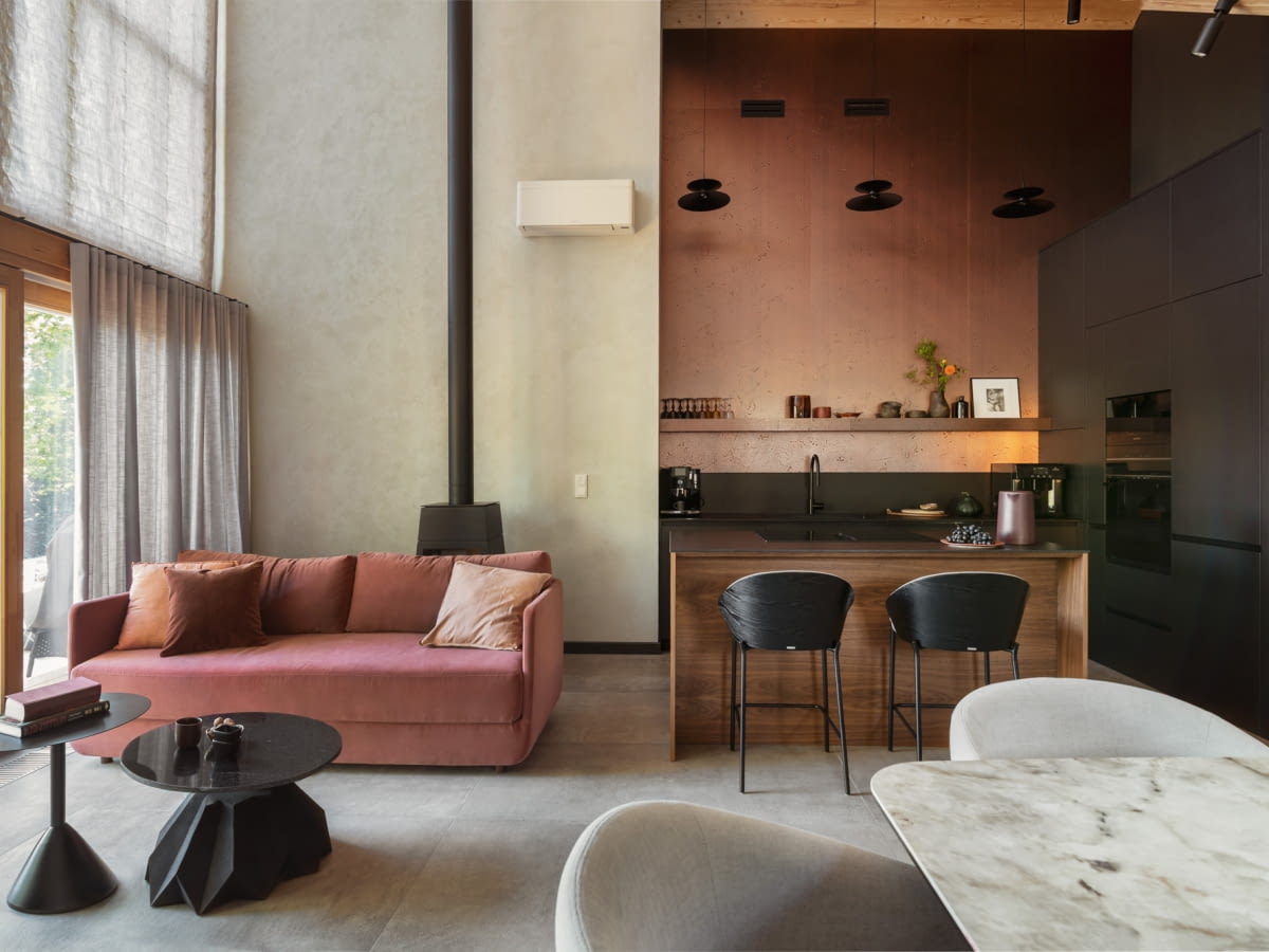 W salonie pierwszoplanową rolę gra sofa w odcieniu różu, subtelnie odwołująca się do klasyki, zestawiona z surową ścianą z betonu strukturalnego. To jeden z najciekawszych przykładów tworzenia wnętrz poprzez świadome kontrasty.