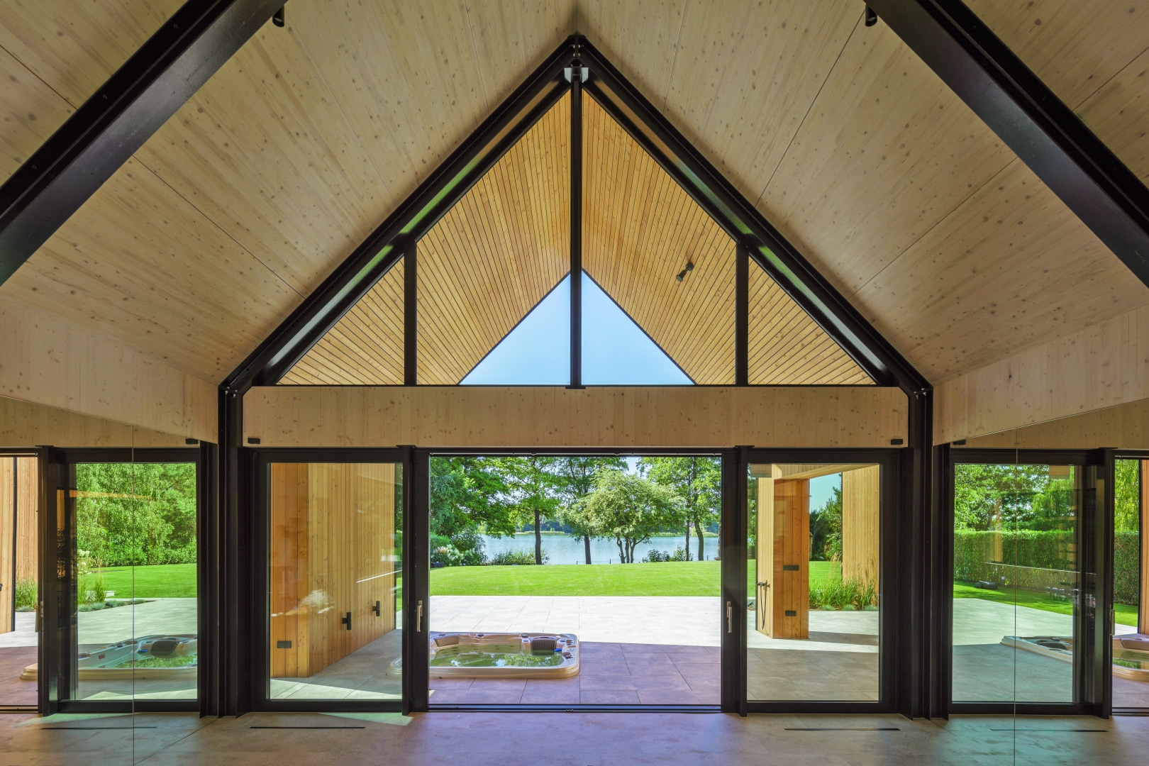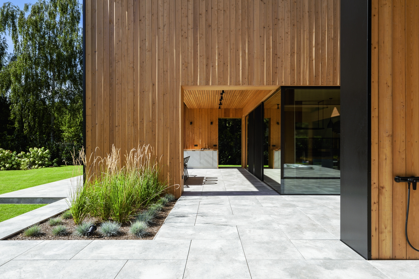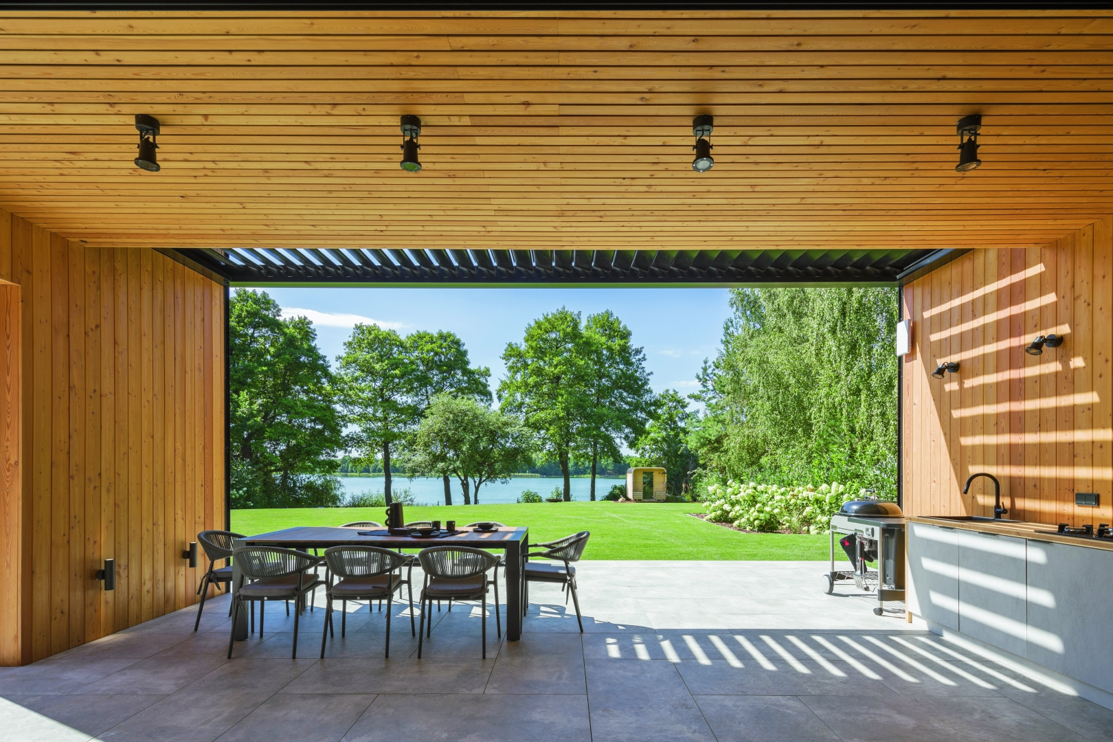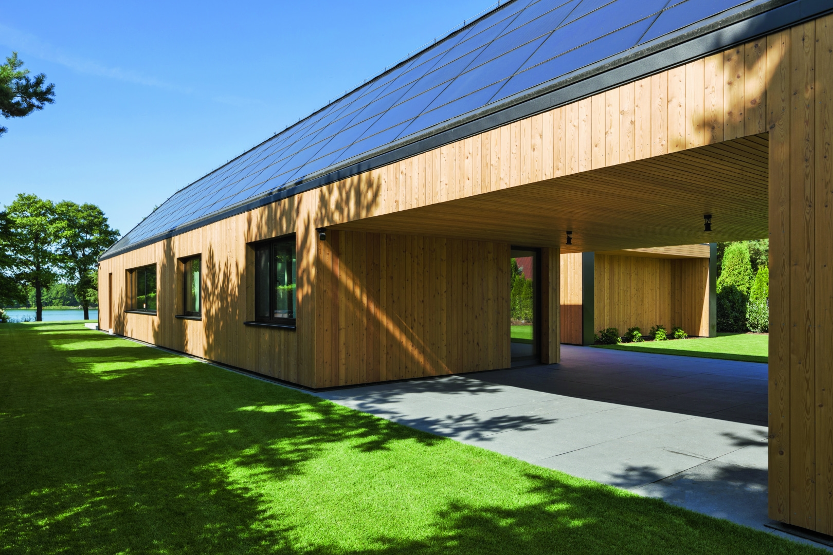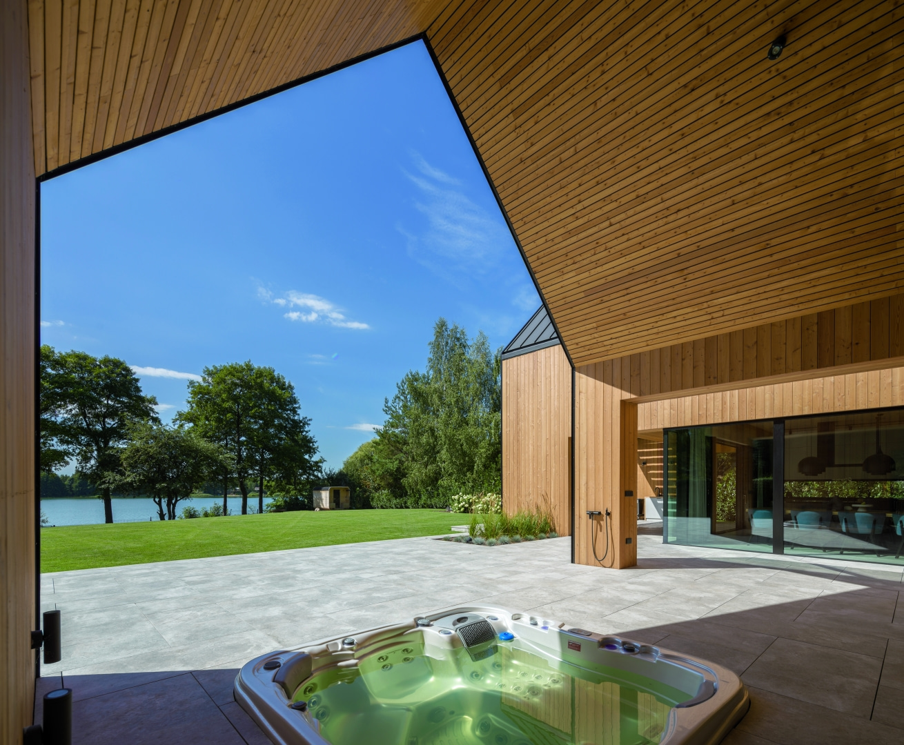 – Forma domu była pomysłem naszej pracowni – przyznaje architekt. – Otrzymaliśmy jednak od właścicieli sporo różnorodnych inspiracji, dzięki czemu finalna koncepcja stanowiła ich interpretację. Od początku wiedzieliśmy, że dom ma pełnić głównie funkcję wypoczynkową. Ma być miejscem oddechu od miasta. W związku z tym główny nacisk położyliśmy na powiązanie domu z otoczeniem. Na połączenie pomieszczeń z ogrodem. Na stworzenie zadaszonych tarasów zewnętrznych. Zakomponowanie widoków z wnętrza na jezioro i na wygodne do niego dojście.