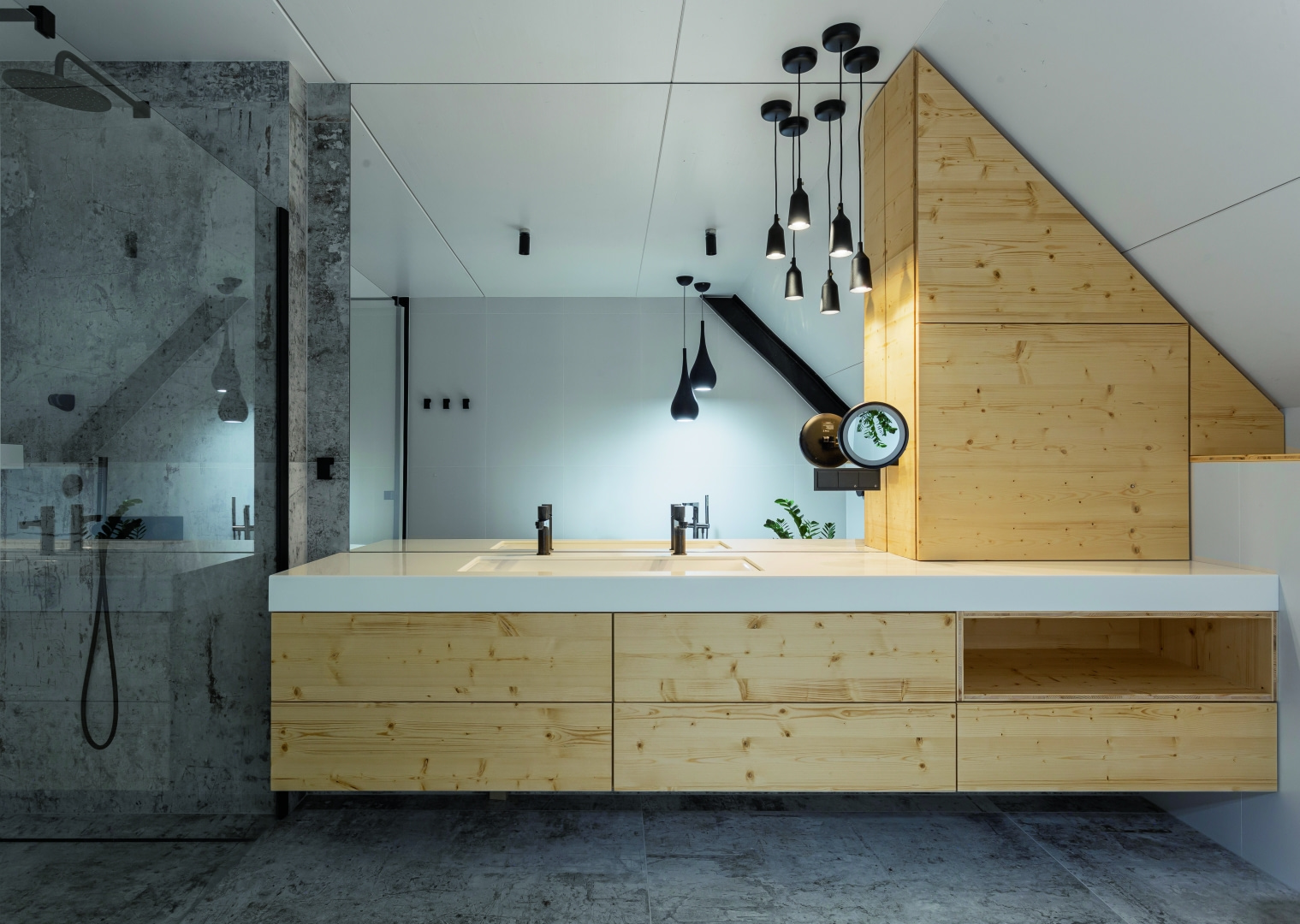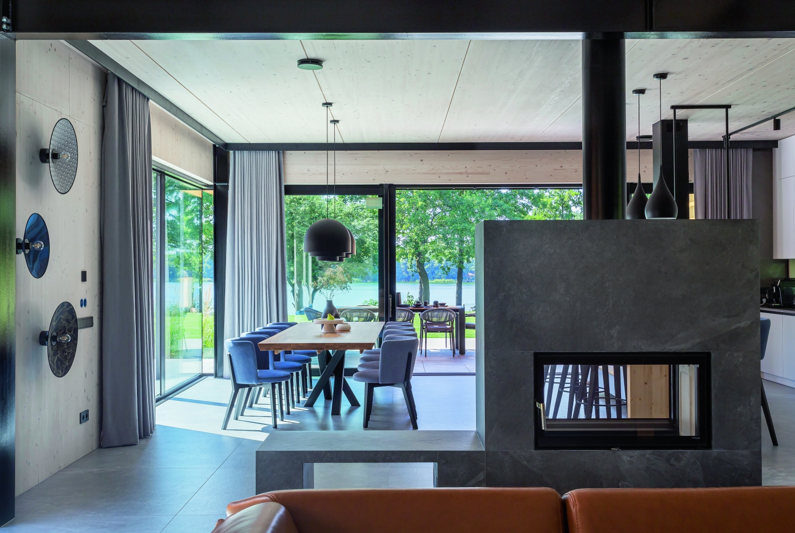 – Ciężko je wskazać, bo w różny sposób korzystamy z domu w zależności od pory roku – przyznają gospodarze. – W lato uwielbiamy spędzać czas na tarasie, ale też wysypiać się w sypialni, gdzie przez otwarte okna wpada śpiew ptaków. Jesteśmy bardzo zadowoleni z siłowni, bo nawet jesienią czy zimą ma w sobie dużo naturalnego światła i przez to zachęca do treningów. Zimą i jesienią zdecydowanie więcej czasu spędzamy wokół salonu i kuchni, korzystając z klimatu tworzonego przez kominek. Doceniamy też możliwość „dogrzania” się w saunie, a następnie schłodzenia w jeziorze.