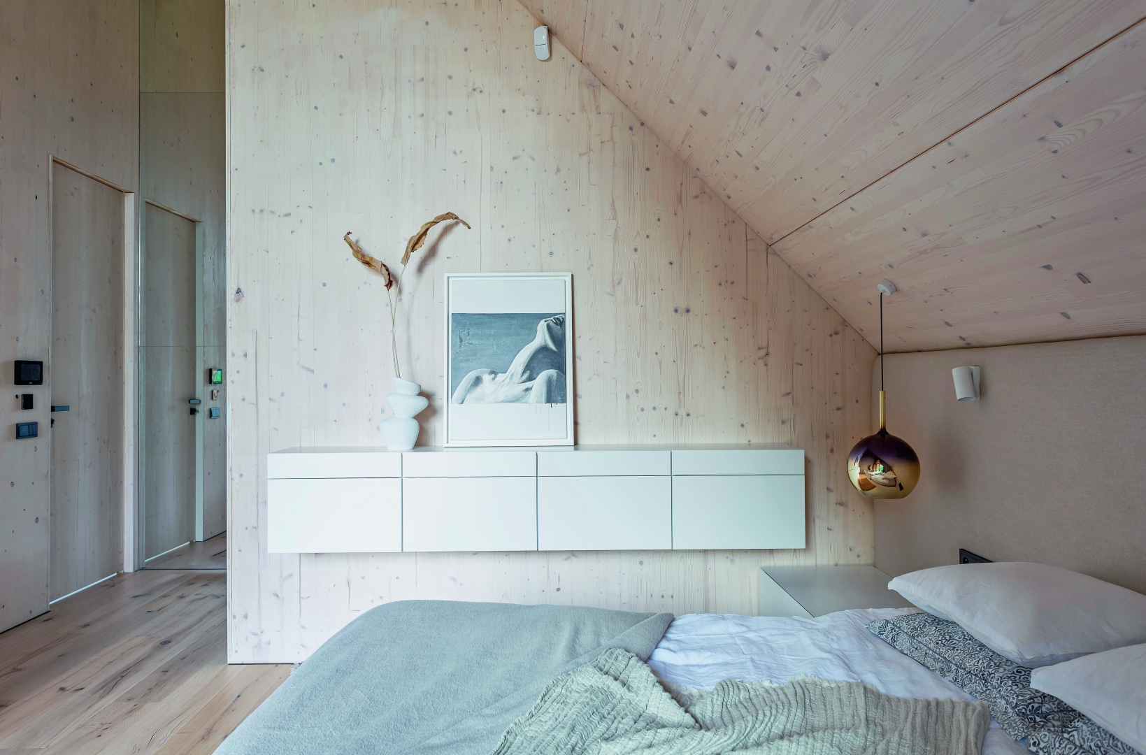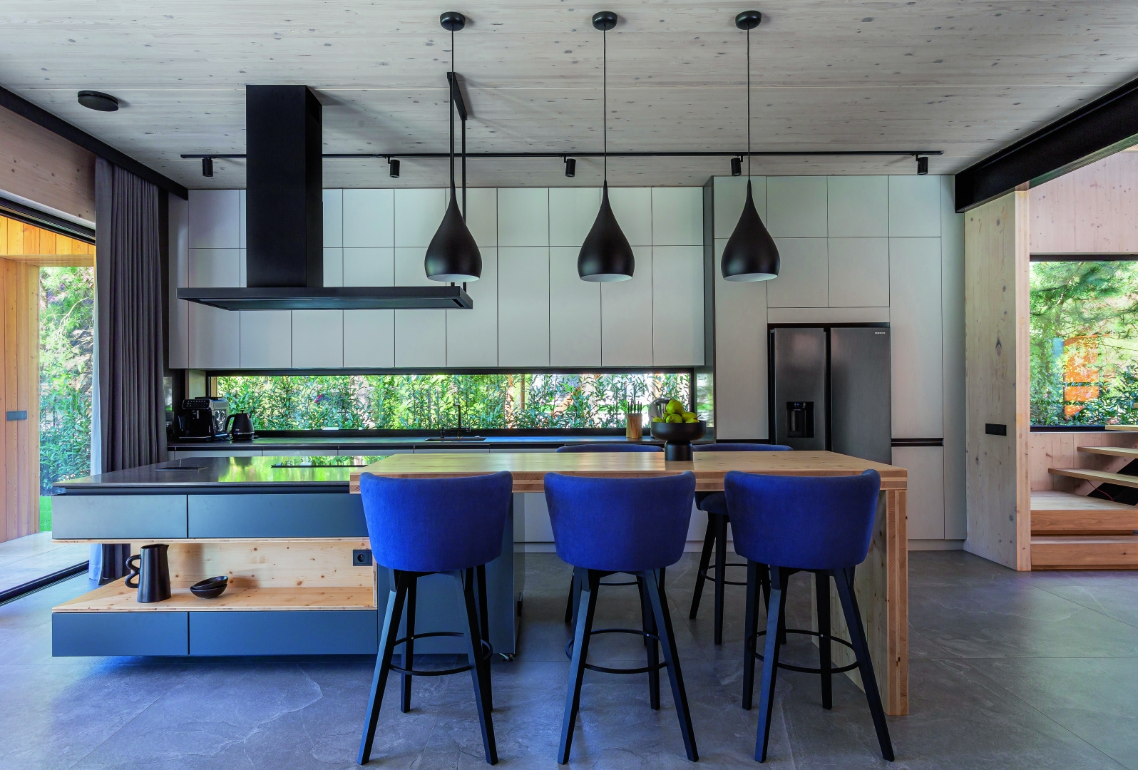 – Wspólnie z architektem wybraliśmy technologię budowy domu CLT, czyli cross laminated timber, krzyżowo klejone drewno – mówią właściciele. – Pozwala ona na realizację dużych otwartych przestrzeni, pomimo wykorzystania drewna jako głównego budulca.