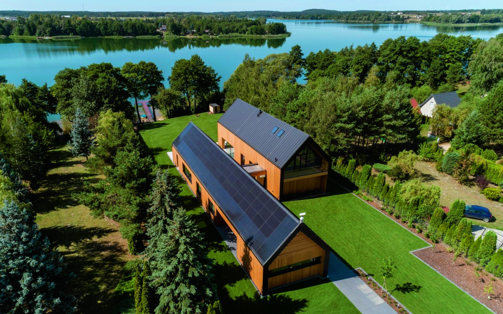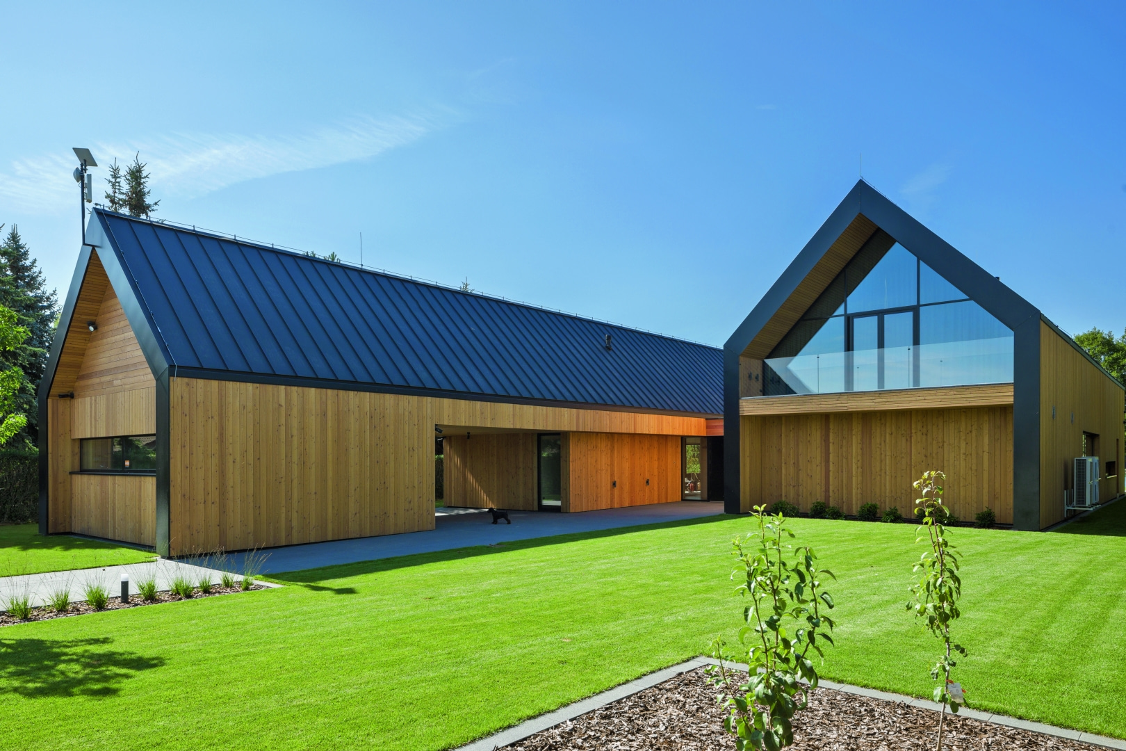 Inwestorzy nie spodziewali się więc tego, co dostali, ale gdy już zobaczyli projekt, błyskawicznie im się spodobał. Działka długa a wąska, ukształtowana z lekkim spadkiem w stronę jeziora, stanowiącego dominantę krajobrazową tego miejsca, zrodziła w Marcinie Klukowskim pomysł rozbicia bryły na dwa równoległe i posadowione koło siebie dwukondygnacyjne obiekty o różnej długości, połączone w jednym miejscu strefą wejścia. Oba utrzymane w stylu nowoczesnych stodół, nieinwazyjne względem otoczenia, udanie wykorzystują zalety przestrzenne terenu i maskują ograniczenia. Wyglądają wręcz z pewnej perspektywy niczym dwie wysokie barki zsuwające się łagodnie w kierunku wody.