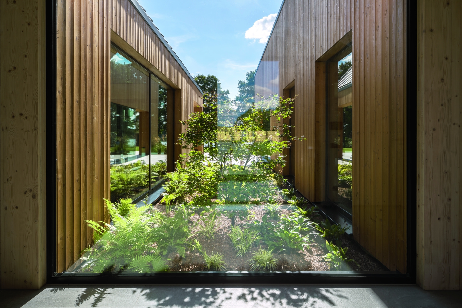 Po drugie, chcieli mieć obszerny trawnik, „na którym można coś porobić”. Po trzecie, zamarzył im się nieduży sad owocowy. Po czwarte wreszcie, najbardziej rzucający się w oczy ogrodowy fragment niejako skondensowali w zupełnie nietypowym miejscu: między skrzydłami obu brył.