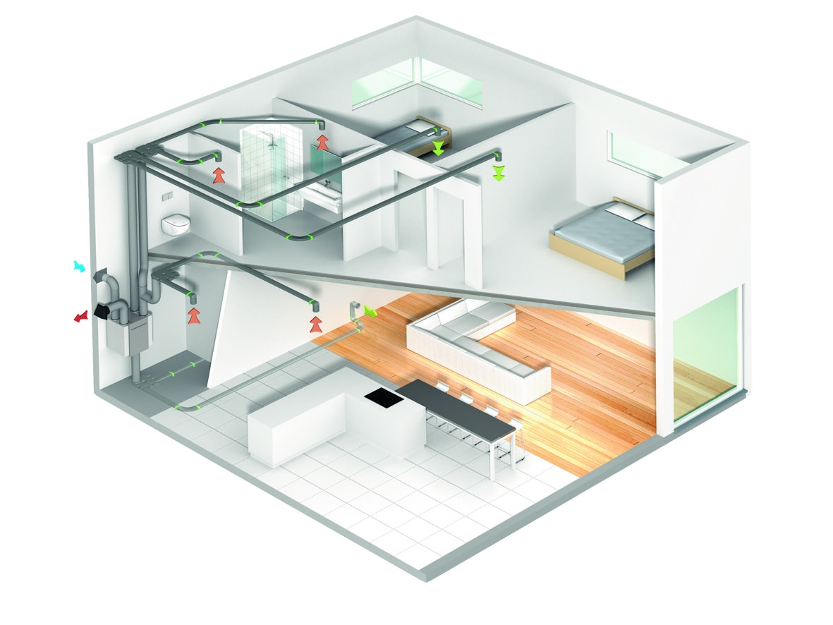 - Bilans powietrza. Projektant dokonuje zbilansowania strumieni powietrza. Ilość powietrza usuwanego powinna być wyrównywana ilością powietrza dostarczanego. Świeże powietrze doprowadzone jest do: sypialni, salonu, gabinetu, pokoju gościnnego. Natomiast powietrze zużyte usuwane jest z: łazienki i toalety, kuchni, wiatrołapu, garderoby, pralni.