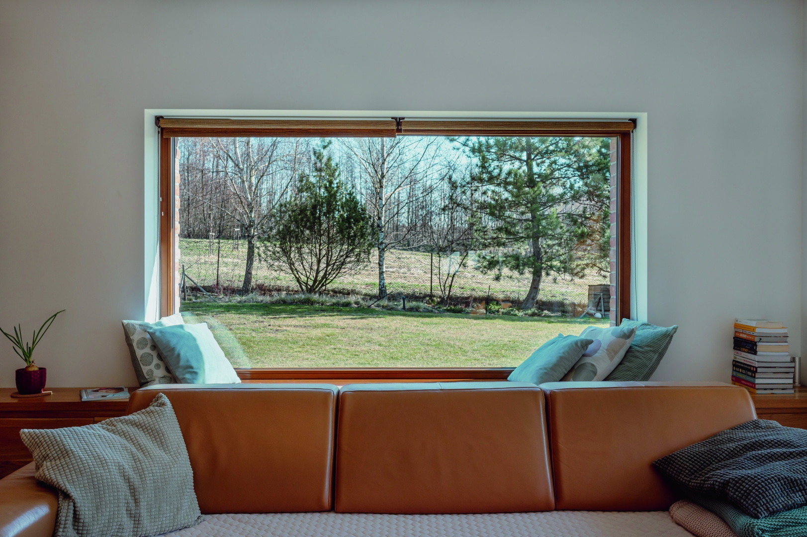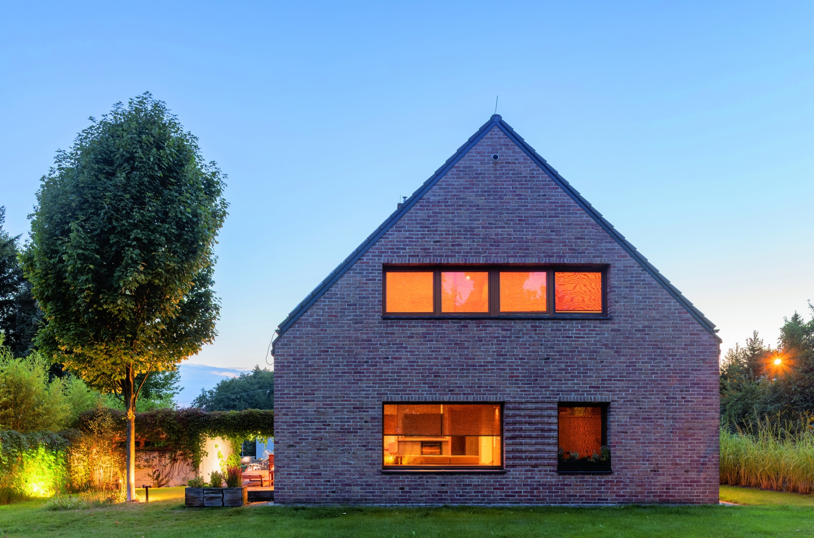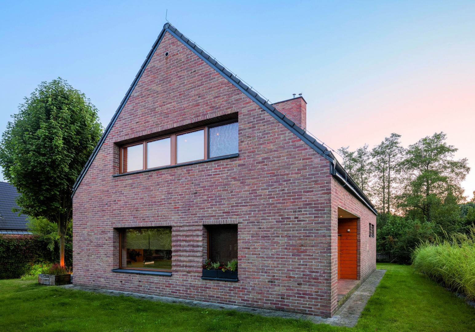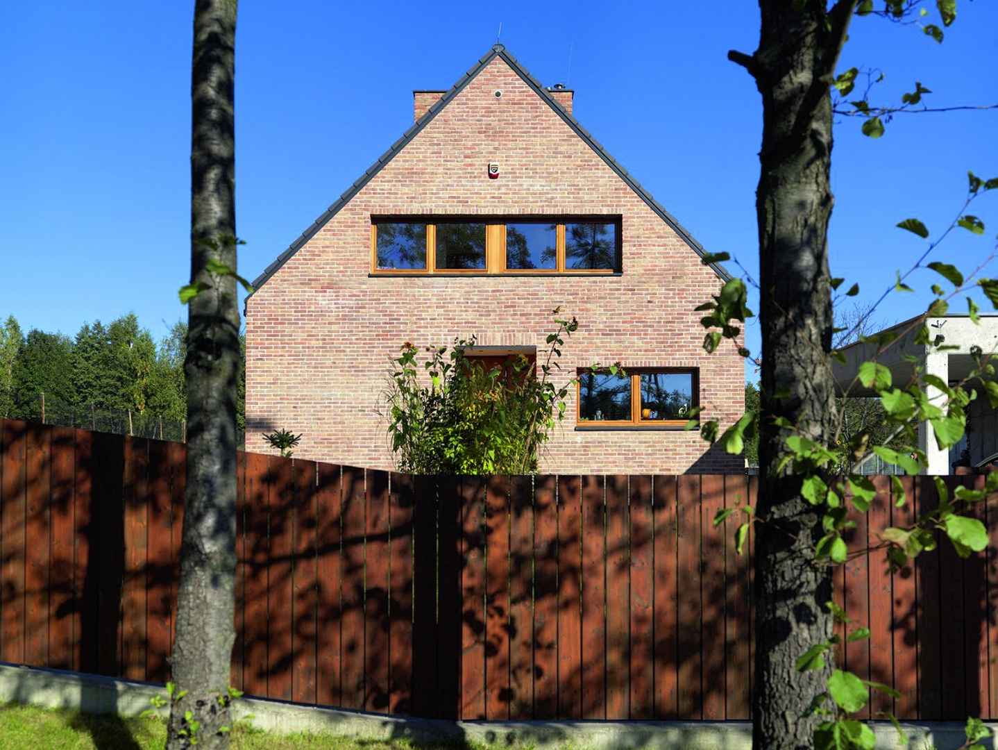 Sam dom miał być nieduży, tak aby na „starość” nie stał w większości pusty i nie okazał się drogi w utrzymaniu. Ot, murowana forma na planie prostokąta, cała w cegle, przekryta dwuspadowym dachem. Skojarzenia z wiejskimi budynkami, jakich pełno od morza do Tatr, są tu natychmiastowe, choć nie brak również akcentów współczesnych – bo „nie epatować nowoczesnością” nie oznacza odwracać się od niej i ją ignorować. Przede wszystkim rzuca się w oczy to, co widać od drogi dojazdowej: poziome pasy niewysokich okien, kojarzące się z dzisiejszą mieszkaniówką, ale i trochę z np. niemieckim modernizmem przełomu lat 20. i 30. ubiegłego wieku. Zwraca też uwagę wyraziste schowanie w głębi bryły drzwi wejściowych do domu. Nowoczesności dodają również eleganckie pasy stalowo-szarych dachówek, zgrabnie wieńczące budynek, w miejsce tradycyjnej czerwonej dachówki ceramicznej. I jeszcze coś – budynek jest w pewien sposób „wsobny”, w pełni jednobryłowy, bo zasadniczo nic z niego nie wystaje. Nawet rynny czy dachowe okapy. To zgrabnie pomyślana, kompaktowa bryła. Nie stało się to jednak tak zupełnie bezboleśnie. Bo okapy wręcz być musiały i kropka!