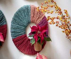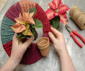 Ciekawą dekoracją ścienną mogą być też „mini doniczki” na poinsecje inspirowane kształtem sombrero. Aby je przygotować, potrzebne są miniaturowe poinsecje w kolorowych glinianych doniczkach oraz obręcze owinięte barwnym sznurkiem. Po przymocowaniu ich do ściany tworzą oryginalną, przyciągającą wzrok kompozycję rodem z meksykańskiej Fiesty. Taka dekoracja podkreśla radosny klimat wnętrza i pozwala w pełni wykorzystać egzotyczny charakter poinsecji.