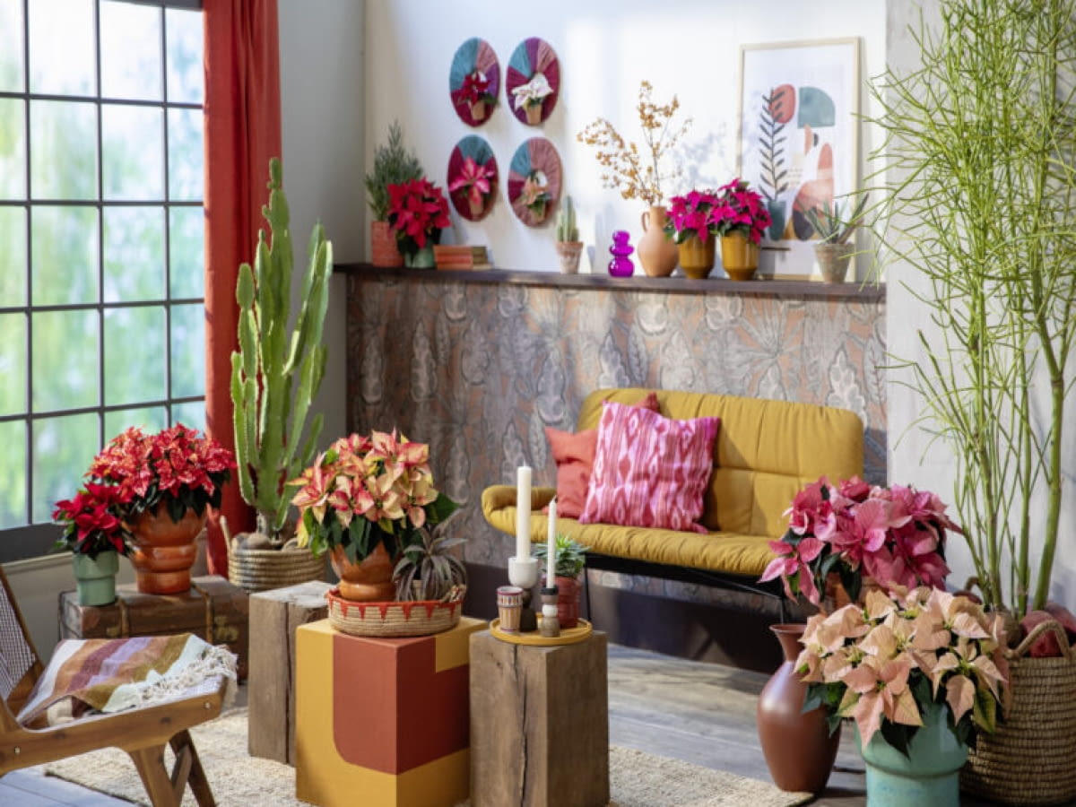 Poinsecje w stylu meksykańskim doskonale komponują się z tropikalnymi palmami, kaktusami oraz naturalnymi materiałami: drewnem, wikliną, ceramiką czy jutą. Wnętrze inspirowane Meksykiem pełne jest kontrastów – mocne kolory spotykają się z naturalną fakturą tkanin, a wyraziste wzory podkreślają żywiołowy charakter przestrzeni.