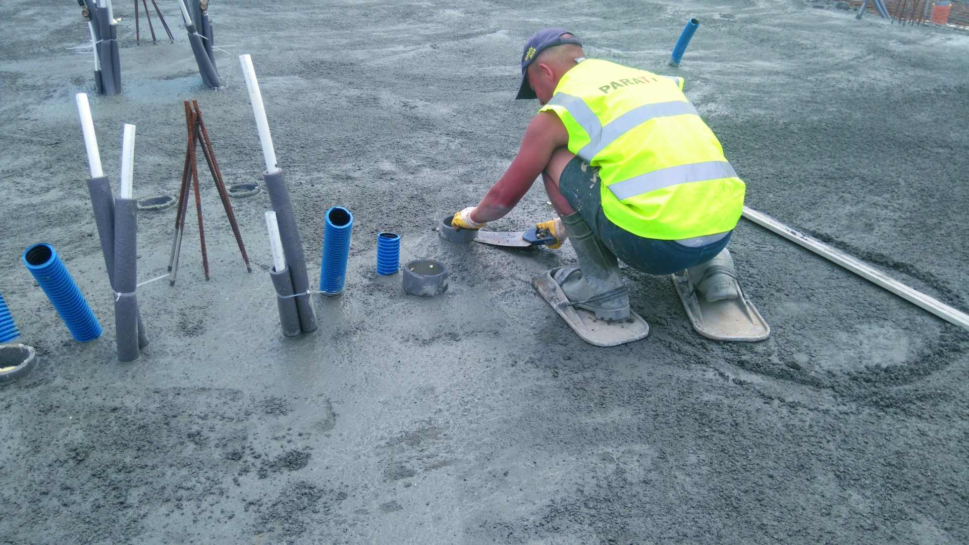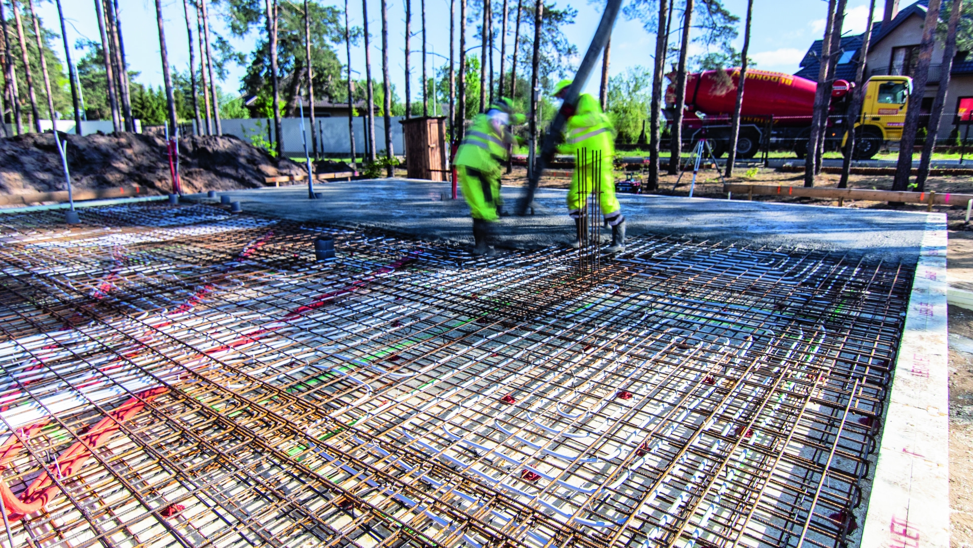 Gdy jest gotowa izolacja płyty, układa się jej zbrojenie. W celu ułatwienia i przyspieszenia prac stosuje się siatki zbrojeniowe lub zbrojenie rozproszone dodawane do mieszanki betonowej
