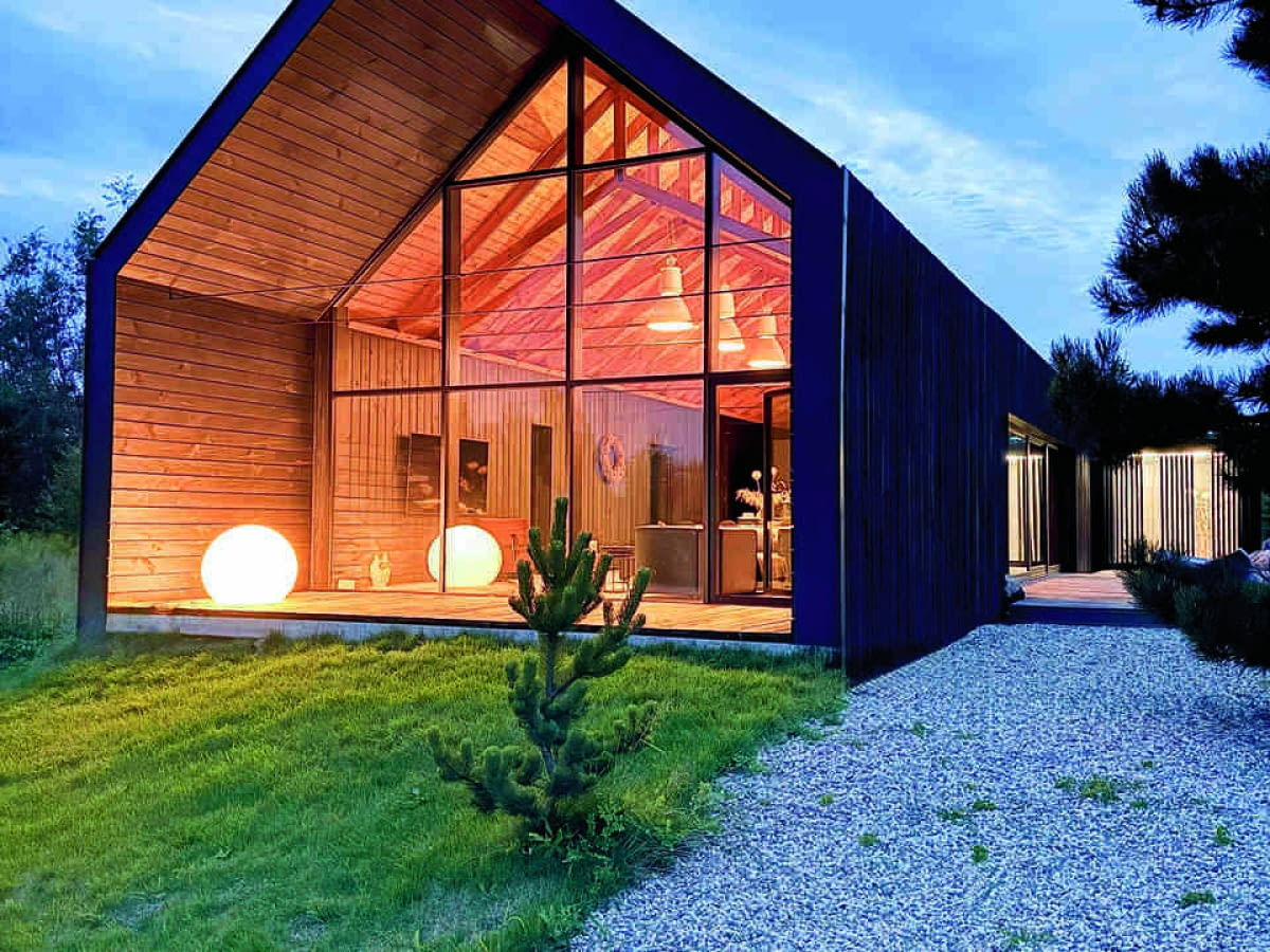 A jednak zrobione jest to tak, że całość robi wrażenie ciekawie zakomponowanego wnętrza, utrzymanego w ryzach z lekka minimalistycznej i jednocześnie eleganckiej formy, w której główną rolę odgrywa naturalny materiał: drewno. Przykładem wspomniana odsłonięta więźba. Niby standard, ale odpowiednio rozmieszczone oświetlenie kreuje w niej nieoczekiwane formy, magiczne światy, Ciekawe, że w pierwszej, użytkowanej przez jakiś czas wersji, ściany wewnętrzne do poziomu wyobrażonego sufitu (wyobrażonego, bo poza obszarem antresoli parter ciągnie się aż pod dach) były pomalowane na biało. Wywoływało to intrygujący efekt. Z jednej strony, kojarzyło się trochę z jednorodzinną architekturą skandynawską, a z drugiej ciekawie uzupełniało się przez wielkie ogrodowe przeszklenia z elewacjami, pierwotnie szarymi.