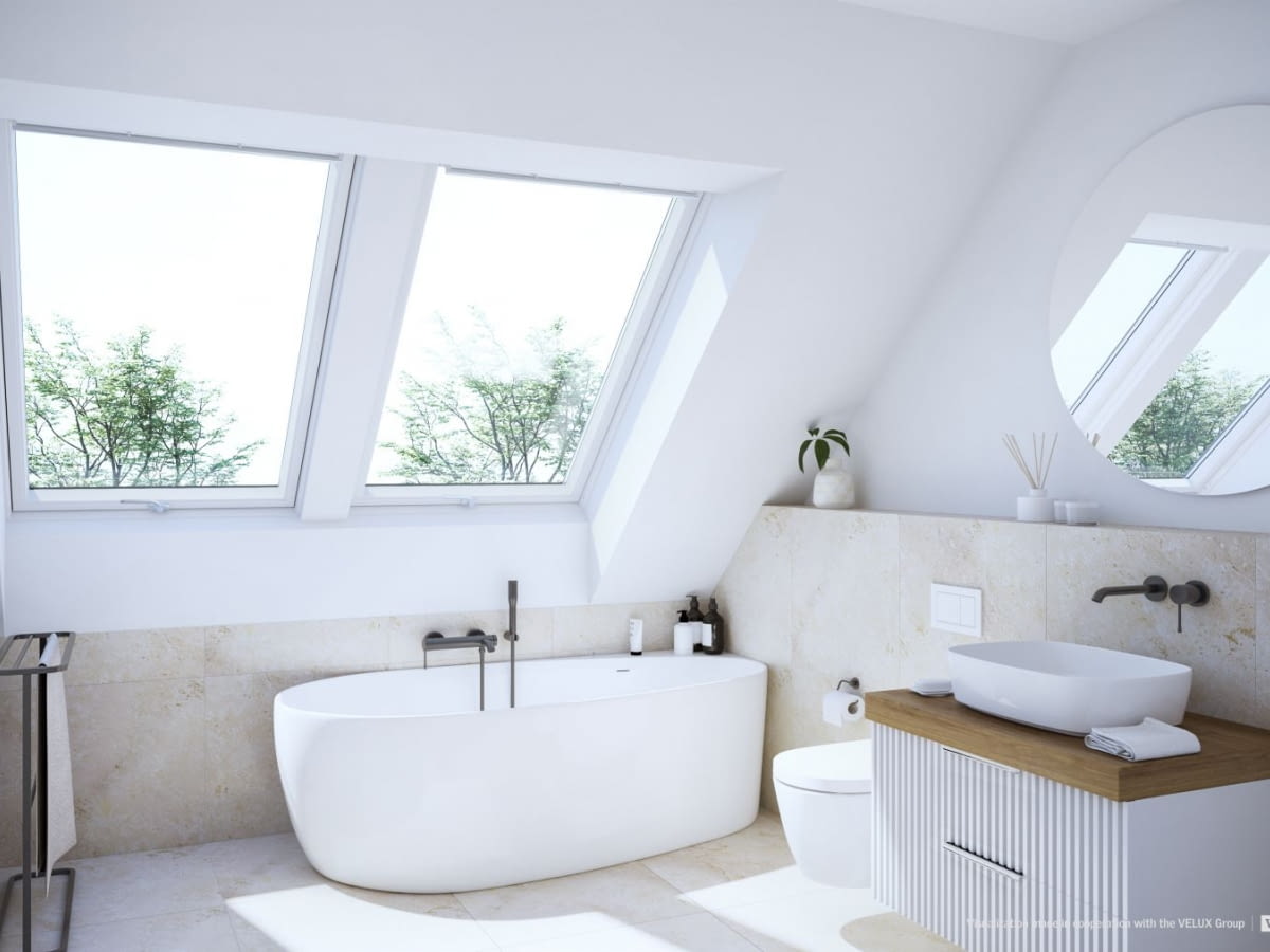 W łazience panuje wilgoć i zmienne temperatury, dlatego kluczowy jest materiał, z którego wykonane są okna dachowe. Dobrym wyborem są drewniano-poliuretanowe okna dachowe VELUX GLU. Dlaczego?