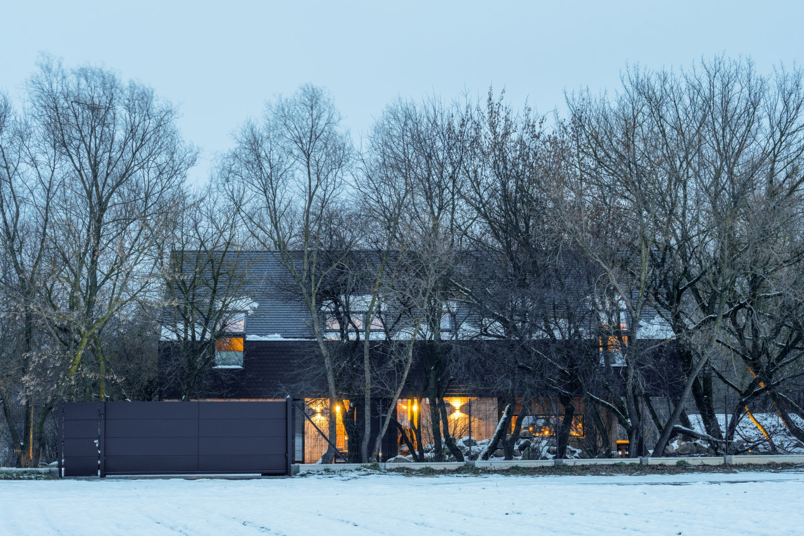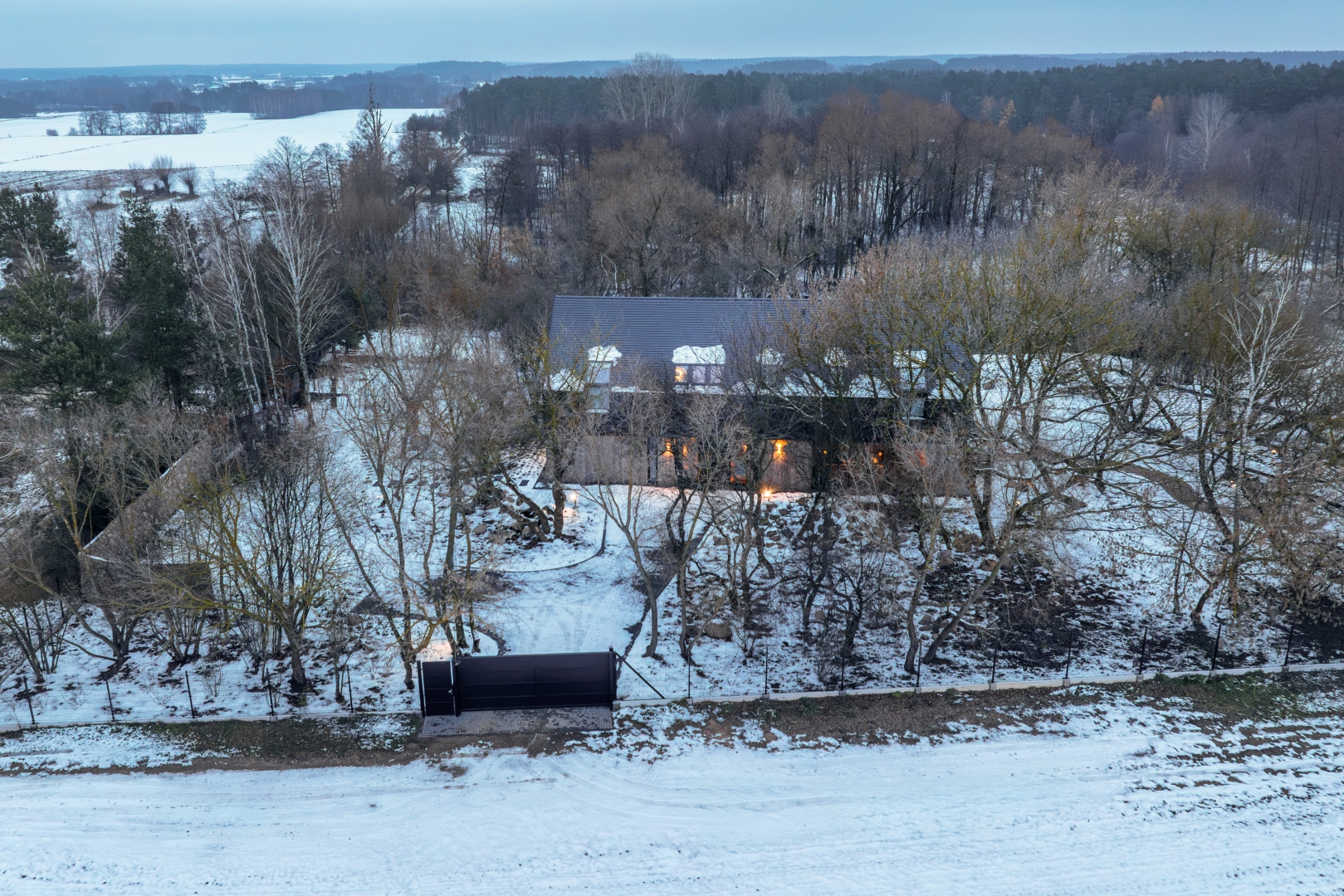 Otoczenie domu Agnieszki Dygant jest wyjątkowe — szerokie pola, pobliski las oraz gęsty, dojrzały drzewostan tworzą scenerię niemal filmową. Zimą to wszystko zyskuje jeszcze bardziej malowniczy charakter: śnieg podkreśla rytm paneli ogrodzenia, ciemny grafit konstrukcji kontrastuje z bielą krajobrazu, prosta forma domu idealnie wpisuje się w surowe otoczenie, a subtelne oświetlenie pod wieczór tworzy klimat rodem wprost ze skandynawskich realizacji architektonicznych. W rezultacie ogrodzenie nie tylko spełnia funkcję praktyczną, ale staje się częścią wizualnej opowieści o nowoczesnym domu w sercu natury.