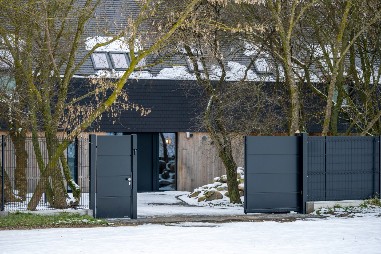 Wokół domu rozciąga się zimowy, niemal surowy krajobraz pól i lasów. Brak sąsiadującej zabudowy dodaje miejscu intymności, dlatego ogrodzenie musiało zapewniać bezpieczeństwo, a jednocześnie nie zakłócać naturalnej harmonii otoczenia. Właśnie z tego powodu wybór padł na system Home Inclusive WIŚNIOWSKI we wzorze AW.10.200 i kolorze RAL 9005 MAT — głębokiej, matowej czerni. To minimalistyczne, solidne ogrodzenia, które doskonale współgrają z nowoczesnym domem w stylu barn-house, podkreślając jego prostą, geometryczną formę.