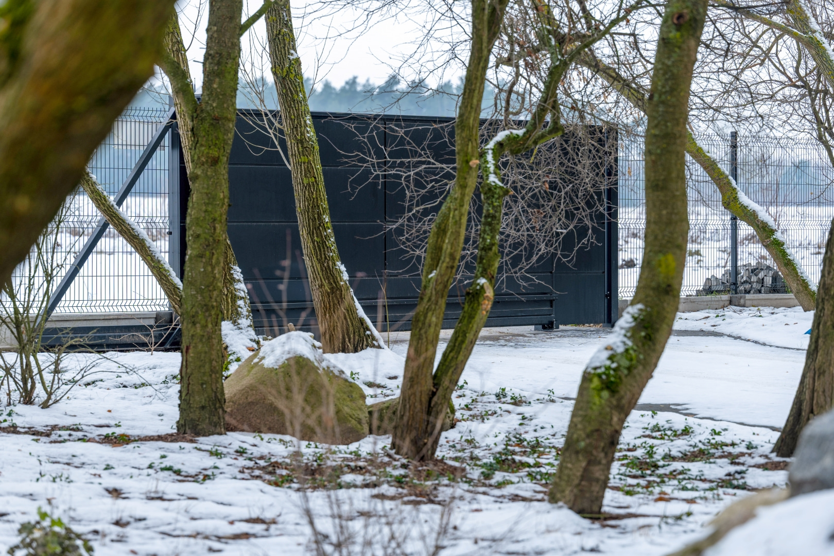 Poza ogrodzeniem Home Inclusive aktorka zastosowała również przemysłową bramę przesuwną PI 95 z panelowym wypełnieniem Vega B od WIŚNIOWSKI. To również konstrukcja samonośna, idealna do wymagających warunków — zwłaszcza zimowych. Wygląda lekko dzięki ażurowemu wypełnieniu, a jednocześnie pozostaje bardzo trwała. W zimowym krajobrazie panel kratowy subtelnie przepuszcza światło i tworzy delikatną, graficzną siatkę na tle śniegu i drzew.