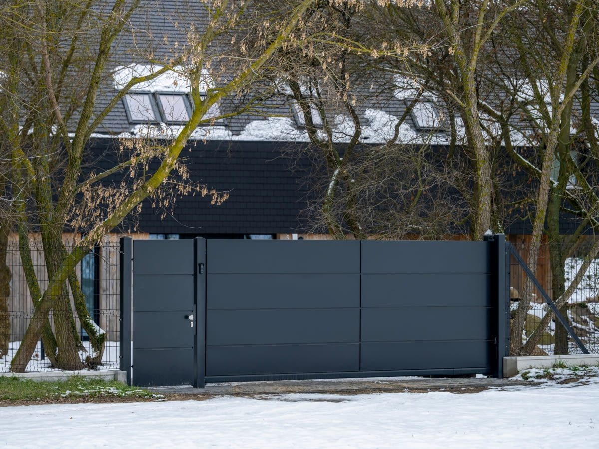 Poza ogrodzeniem Home Inclusive aktorka zastosowała również przemysłową bramę przesuwną PI 95 z panelowym wypełnieniem Vega B od WIŚNIOWSKI. To również konstrukcja samonośna, idealna do wymagających warunków — zwłaszcza zimowych. Wygląda lekko dzięki ażurowemu wypełnieniu, a jednocześnie pozostaje bardzo trwała. W zimowym krajobrazie panel kratowy subtelnie przepuszcza światło i tworzy delikatną, graficzną siatkę na tle śniegu i drzew.