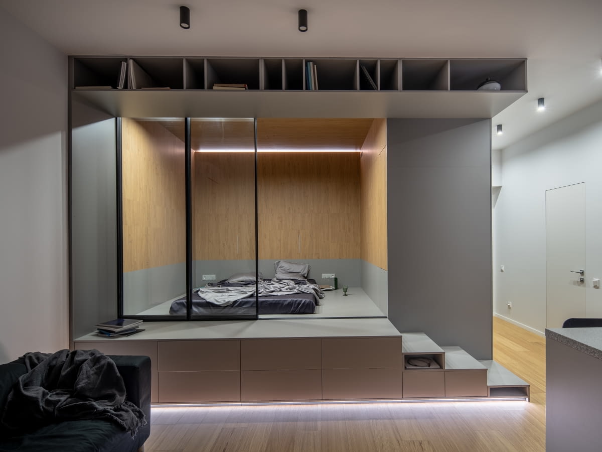 W niewielkich mieszkaniach łóżko często zajmuje znaczną część pokoju dziennego. Podest umożliwia umieszczenie materaca wyżej i wykorzystanie miejsca pod nim na szuflady lub schowki. Najczęściej stosuje się wysokość około 60 centymetrów. W takiej zabudowie można przechowywać pościel, sezonowe ubrania, pudełka czy sprzęt sportowy. Dostęp do łóżka zapewniają stopnie, które można zaprojektować jako dodatkowe schowki. Różnica poziomów wyznacza miejsce przeznaczone na sen bez stosowania ścian działowych.