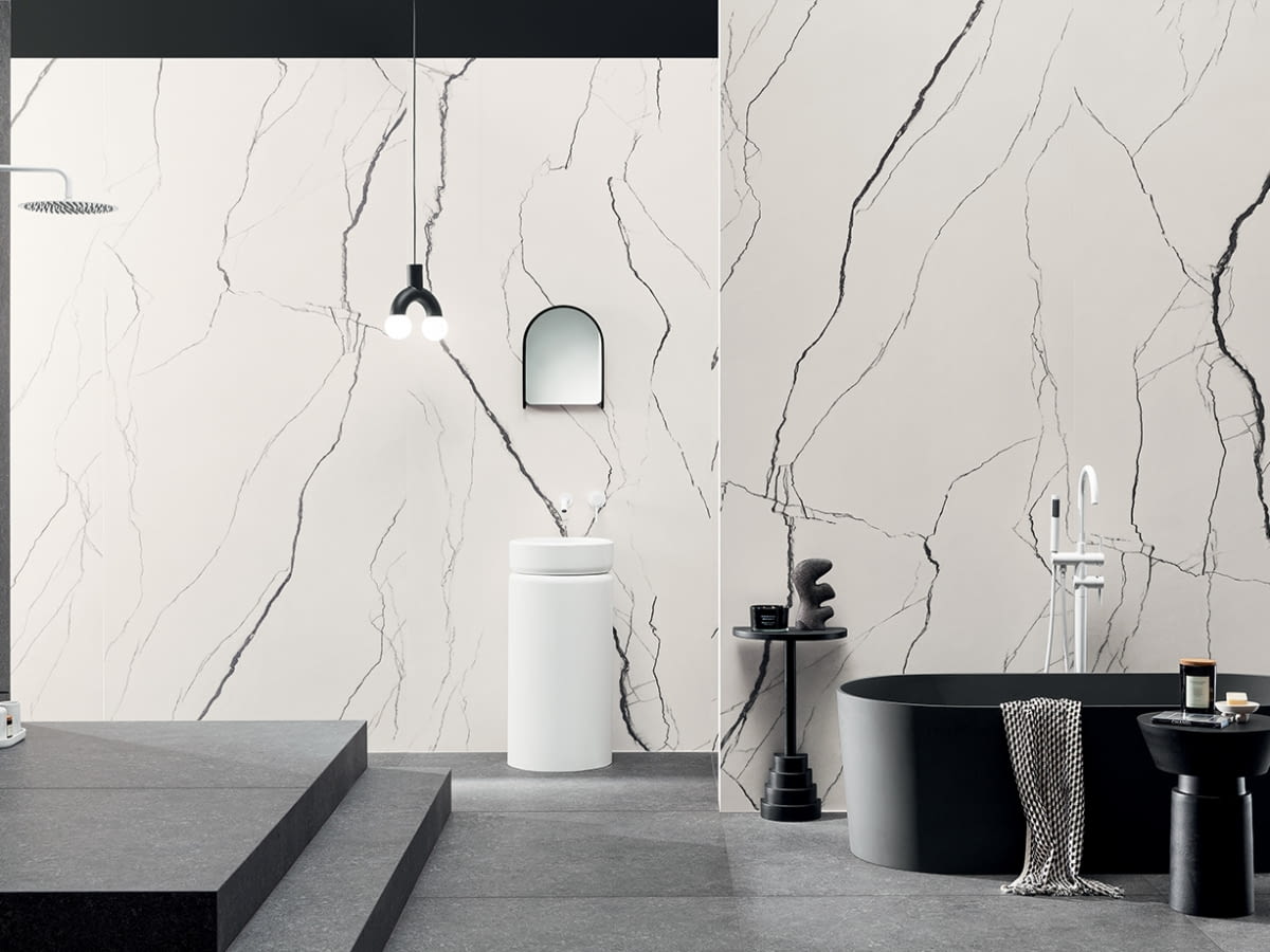 Gres, beton, tapeta, a może drewno lub szkło? Nieśmiertelne płytki ceramiczne mają wielu konkurentów. Wybór materiałów na ścianę do łazienki jest olbrzymi.