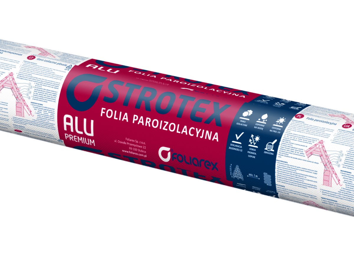Strotex AL to wysokiej jakości metalizowana folia zbrojona o podwyższonej wytrzymałości na uszkodzenia mechaniczne, stosowana na dachach skośnych, płaskich oraz wewnątrz ścian budynków.