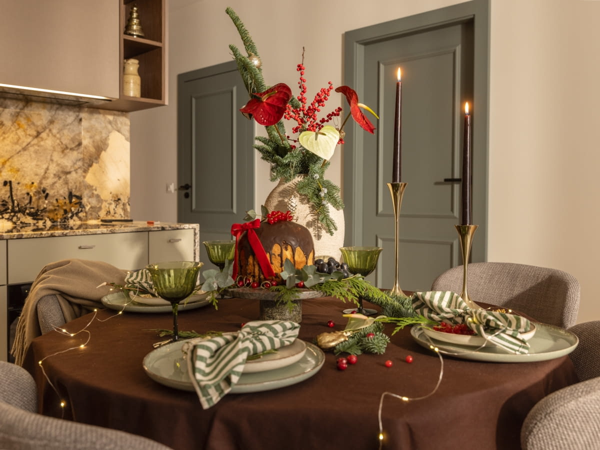 Dekoracje utrzymano w palecie zieleni, złota i głębokiej czerwieni, idealnie dopasowanej do reszty mieszkania. Tkaninowe serwetki w pasy zielono- kremowe, wysokie świece, szklane puchary w butelkowej zieleni oraz gałązki z owocami tworzą lekką, nastrojową kompozycję. Ta stylizacja pokazuje, że bożonarodzeniowy stół może wyglądać odświętnie bez nadmiaru ozdób – wystarczy kilka starannie dobranych detali, aby wyczarować elegancki i przytulny klimat.