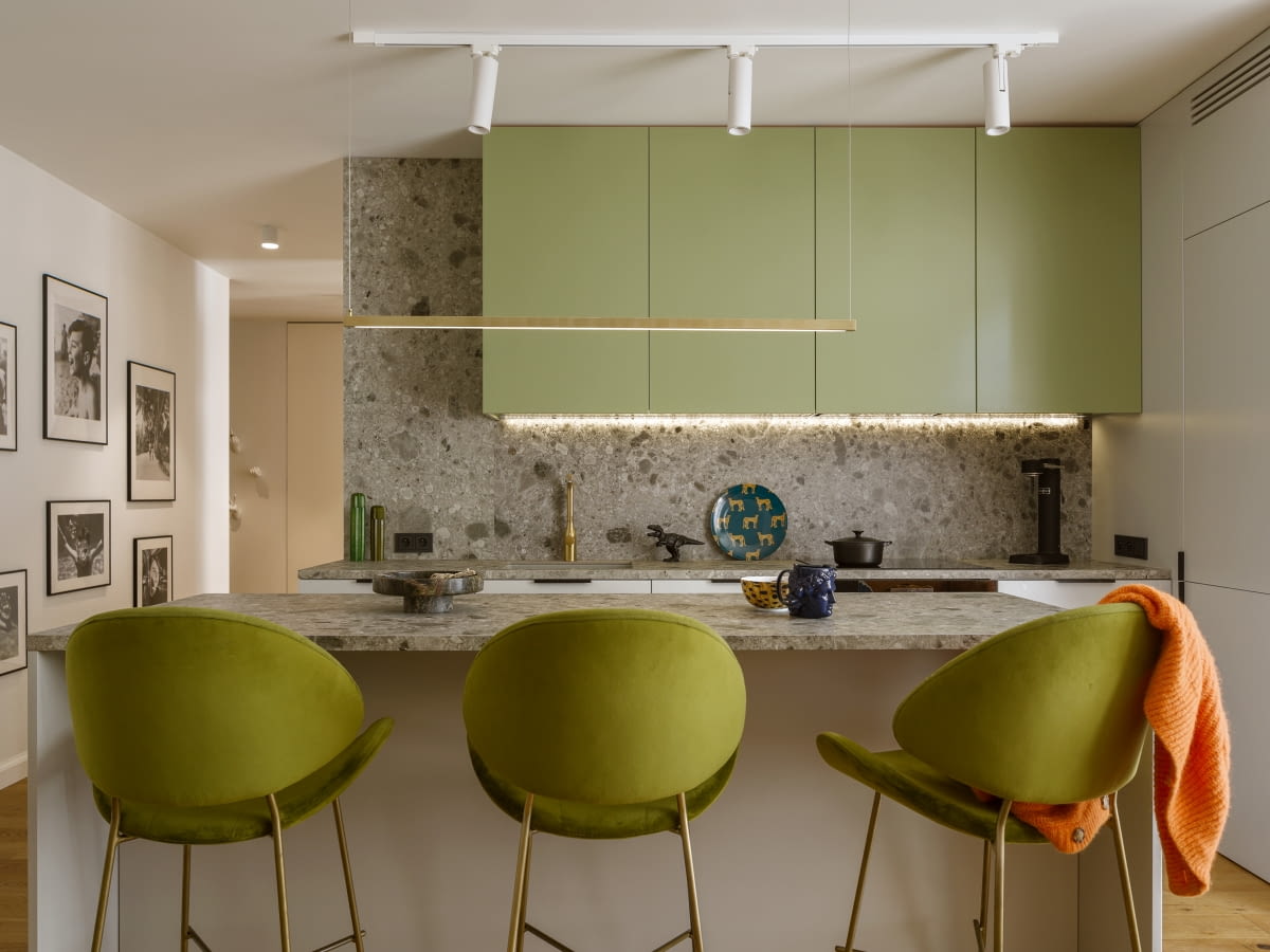Inwestorka nie ukrywała oczekiwań - barwy miały działać jak antydepresant. Architektka zaproponowała paletę opartą na kolorach pomarańczowym, różowym i zielonym, które zestawiła ze złamaną bielą i lastryko w odcieniach szarości. Od wejścia "wita" gości abstrakcyjny mural. Kuchnię zaprojektowano w odcieniu oliwki, którą tonuje jasne tło, a kompozycję uzupełnia czarno-biały osprzęt Gira, dopasowany do kolorystyki ścian i frontów. Detale - choć dyskretne - są tu elementem "porządkującym", a nie wyłącznie ozdobą.