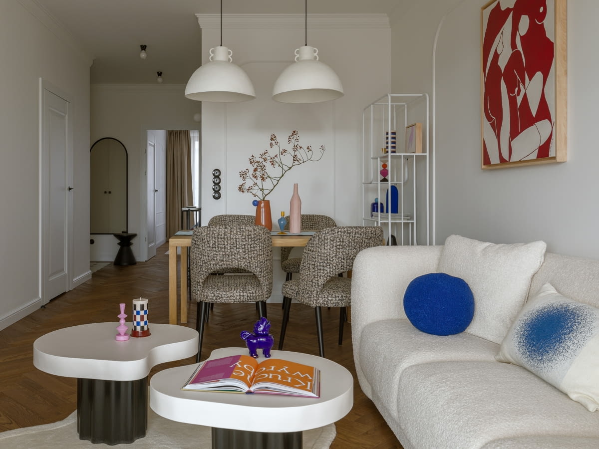 Przestrzeń wypoczynkową płynnie łączą z jadalnią drewniany stół otoczony tapicerowanymi fotelami oraz lekki, ażurowy regał. To miejsce, gdzie spotykają się klasyka i współczesność – z odrobiną designerskiego humoru.