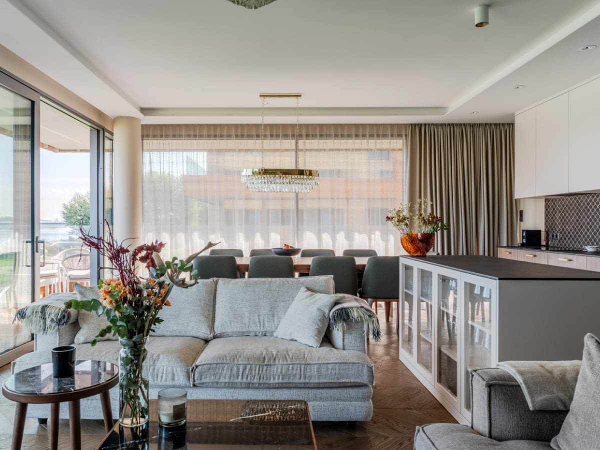 Projekt mieszkania w inwestycji Riva Zegrze to przykład umiejętnego łączenia nowoczesnych form z klasycznymi detalami, tworzącego spójną przestrzeń pełną światła i wizualnego ładu. Każdy element - od proporcji mebli po dobór tkanin - został podporządkowany idei komfortu i wizualnej równowagi.