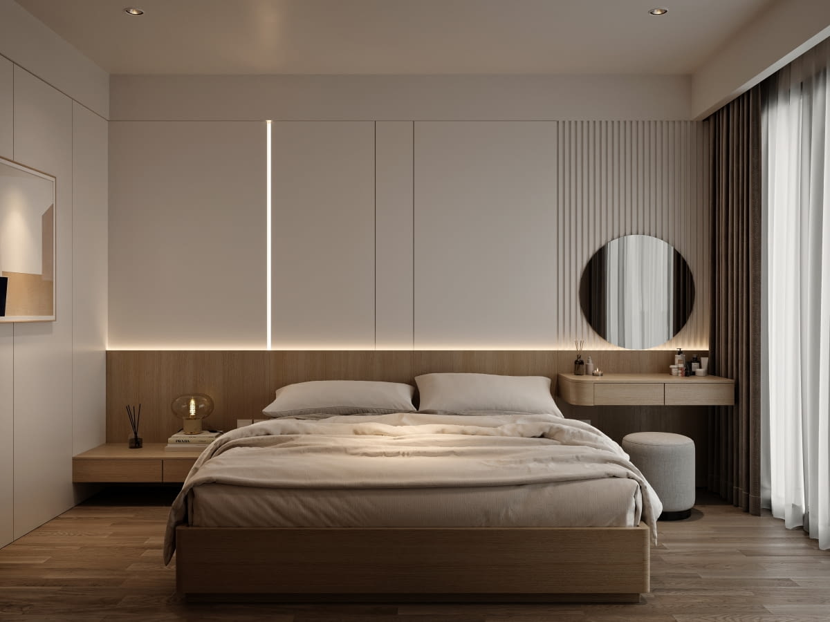 Oświetlenie w minimalistycznej sypialni pełni funkcję "konstrukcyjną". Nie chodzi jedynie o widoczność, ale o modelowanie przestrzeni za pomocą światła i cienia. Zamiast ozdobnych lamp dominują źródła światła ukryte w strukturze wnętrza – oprawy wpuszczane w sufit lub zabudowę meblową, taśmy LED, kinkiety o prostej formie. Ich rozmieszczenie powinno wspierać rytm dnia i nocy: światło ogólne rozprasza się równomiernie, a punktowe sprzyja relaksowi przed snem.