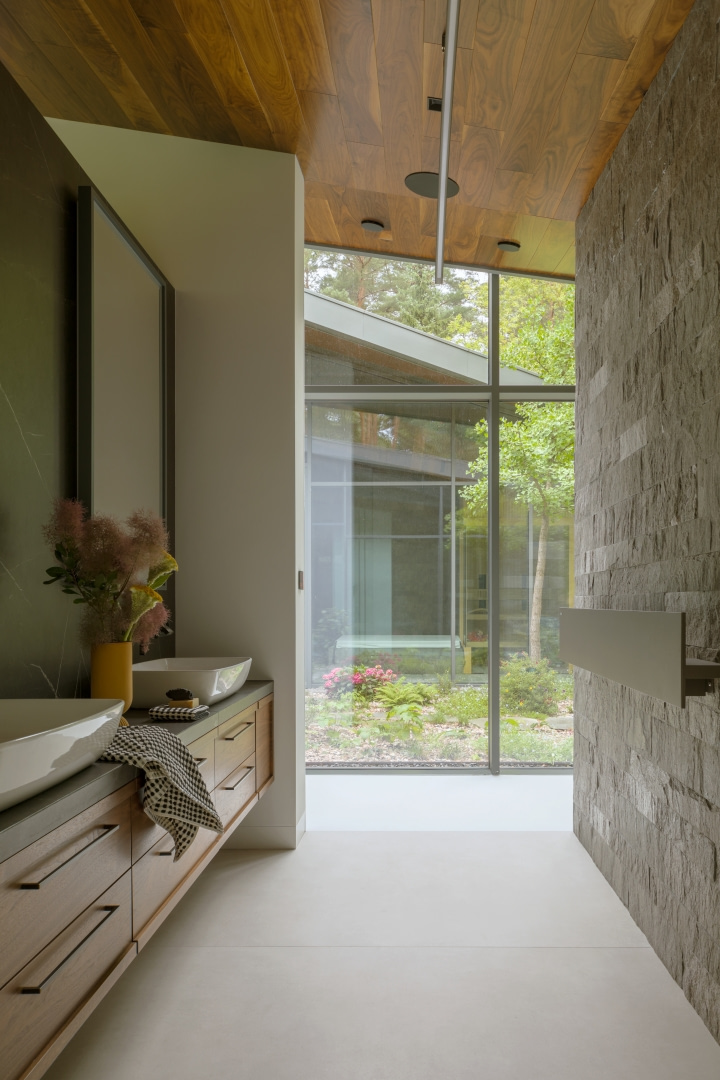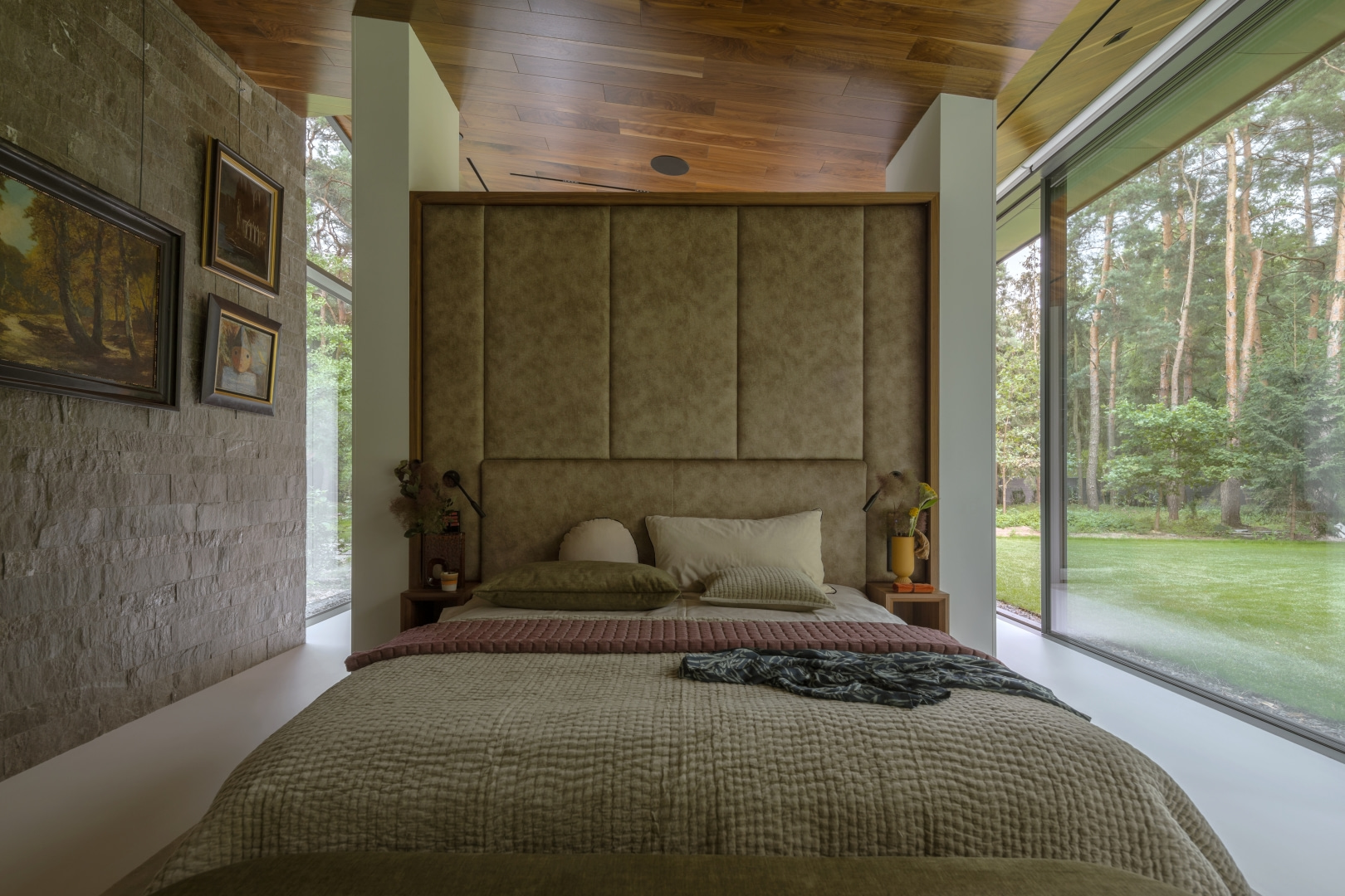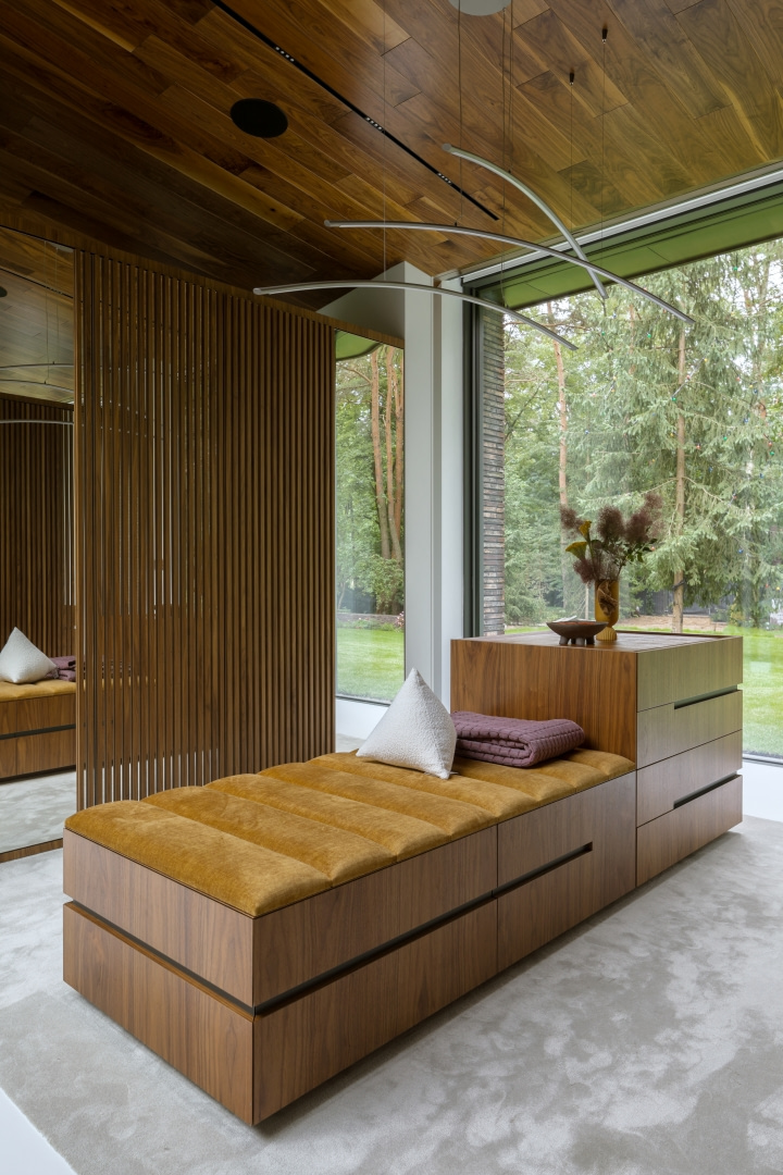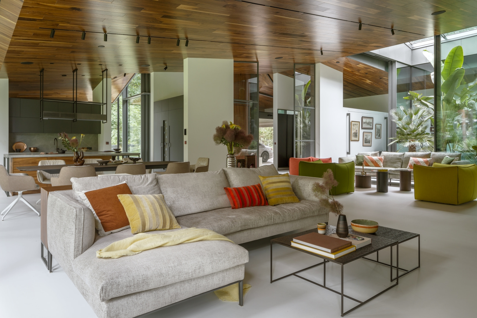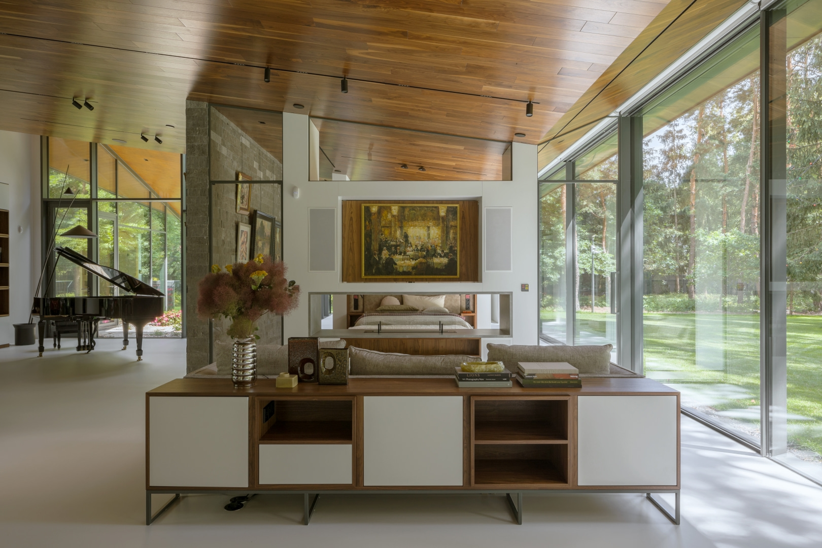 W tej spektakularnej przestrzeni wnętrza zaprojektowała pracownia HOLA Design. 400-metrowy parterowy dom wyróżnia się otwartą aranżacją, sprzyjającą bliskości mieszkańców. Przestrzeń jest nie tylko funkcjonalna, lecz także pełni rolę miejsca kontemplacji sztuki i muzyki – szczególnym elementem wyposażenia jest fortepian Steinway Spirio, pozwalający cieszyć się mistrzowskimi wykonaniami utworów w domowym zaciszu.