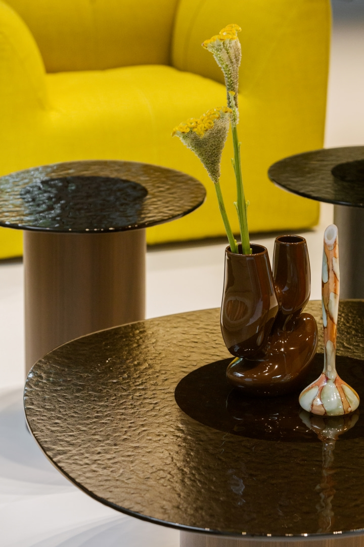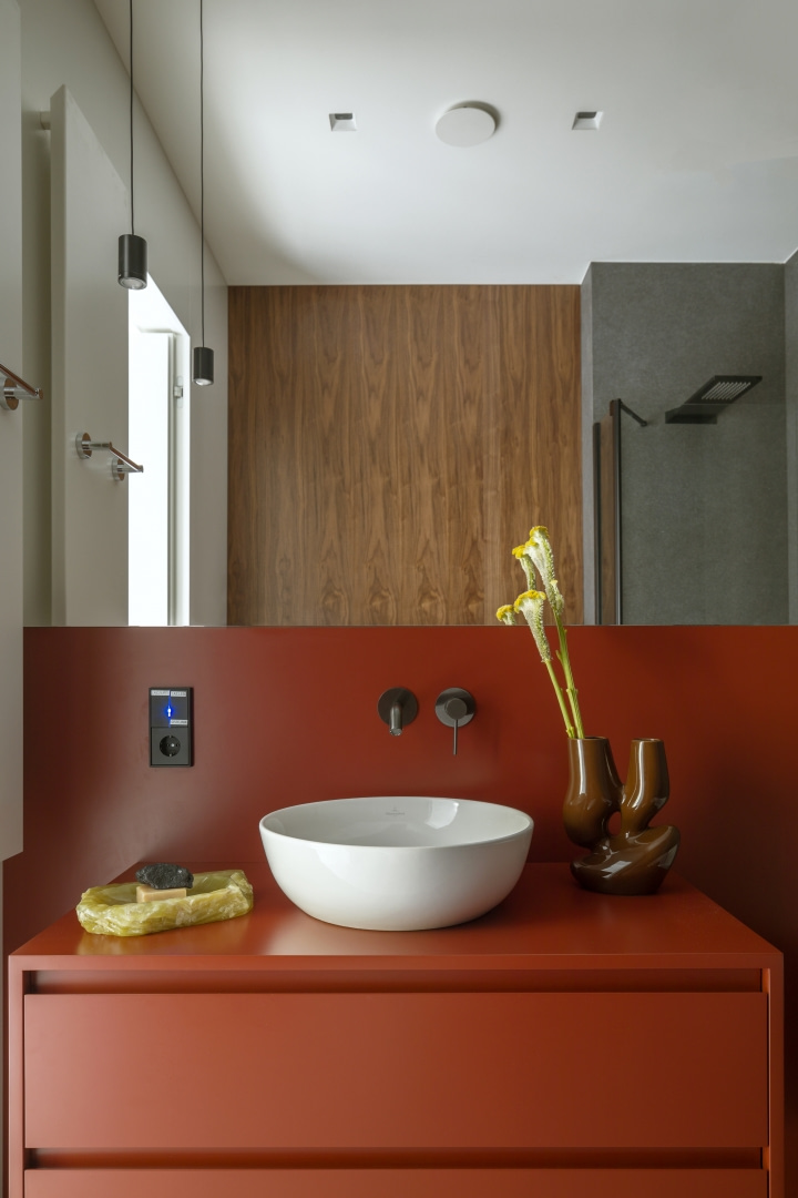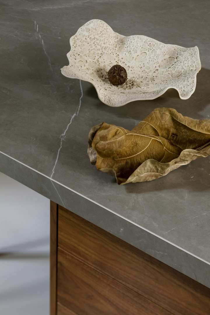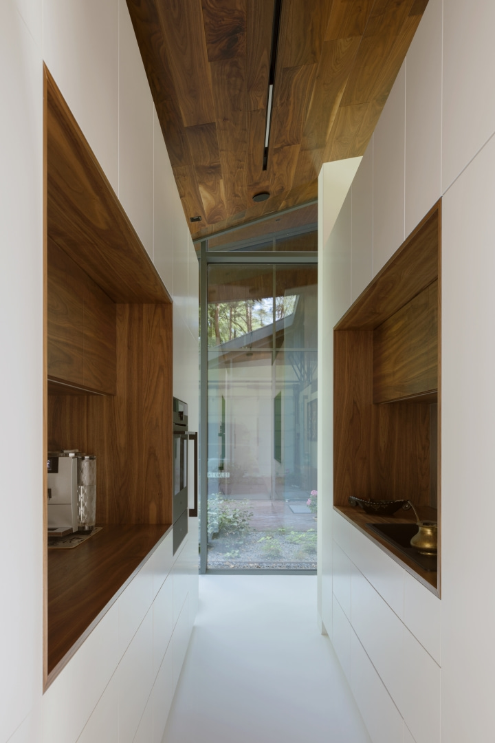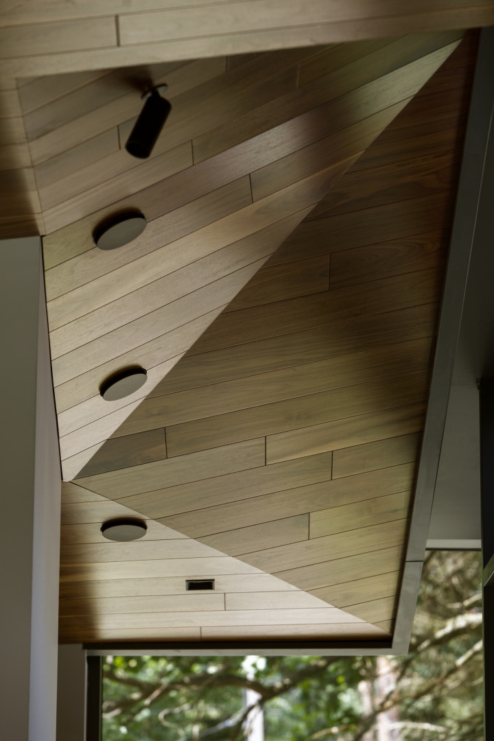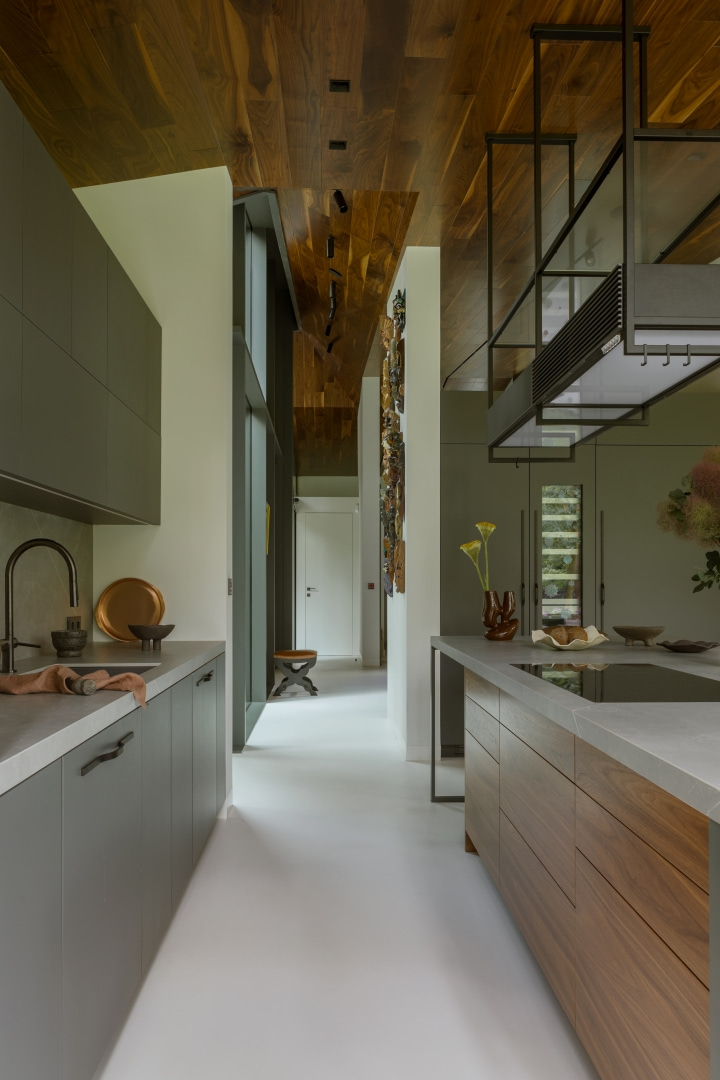 Projekt wnętrz oparty został na odwróceniu konwencji – biel i gładkość podłogi z żywicy kontrastują z orzechowym sufitem, którego skomplikowana tektonika nadaje przestrzeni rytm i charakter. Ocieplenie wnętrz zapewniają naturalne materiały i wyrafinowane designerskie obiekty.