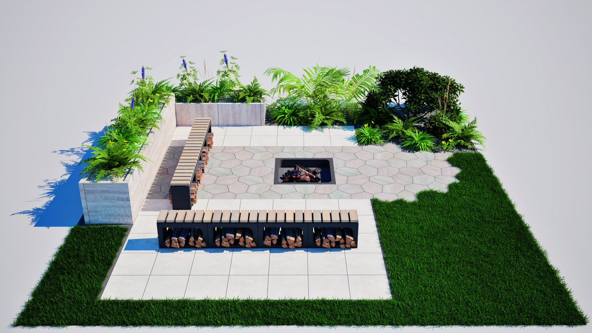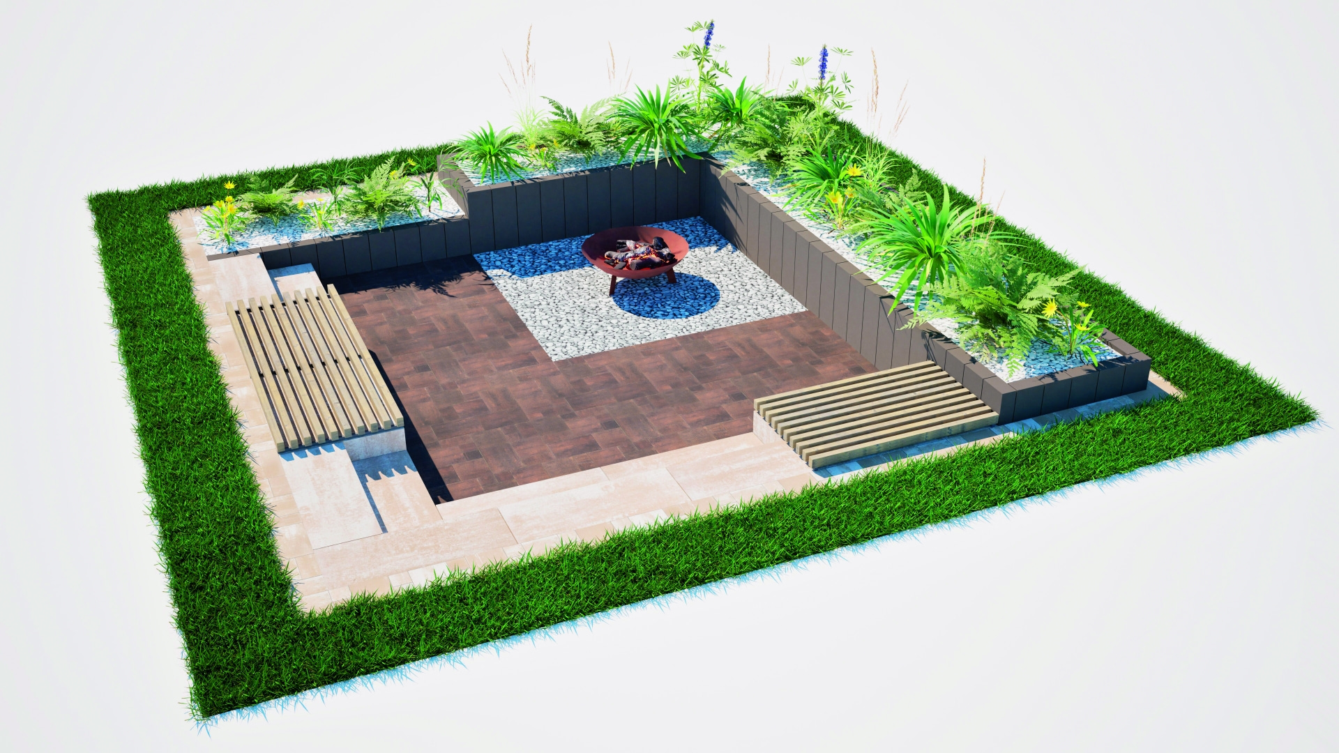 Do aranżacji przestrzeni ogrodowej doskonale nadają się elementy małej architektury wykonane z betonu. Zamiast budować schody można je ułożyć z gotowych stopni. Są one gładkie i dopasowane kolorystycznie do nowoczesnych aranżacji (nerino, szary czy grafitowy). Świetnie sprawdzają się w roli schodów trasowych, ale też w przypadku wgłębnika. Z elementów betonowych w prosty sposób możemy także zbudować palenisko, wygodną ławkę lub zorganizować zieleń. Do budowy nowoczesnych i stylowych donic wykorzystać można też palisady. Jaka powinna być zieleń w nowoczesnym ogrodzie? Tu również ceniony jest minimalizm. W modzie są trawy ozdobne, rośliny zimozielone, karłowate iglaki czy zioła. Coraz bardziej rozpowszechniają się ogrody naturalne lub oszczędzające wodę, do których wkrada się kontrolowany chaos. Stąd na popularności zyskują kwietne łąki powstające na poletkach w formie prostokątów lub koła. Coraz częściej praktykowanym trendem jest również xeriscaping, czyli dobór takich roślin, które są odporne na susze i nie wymagają częstego podlewania.