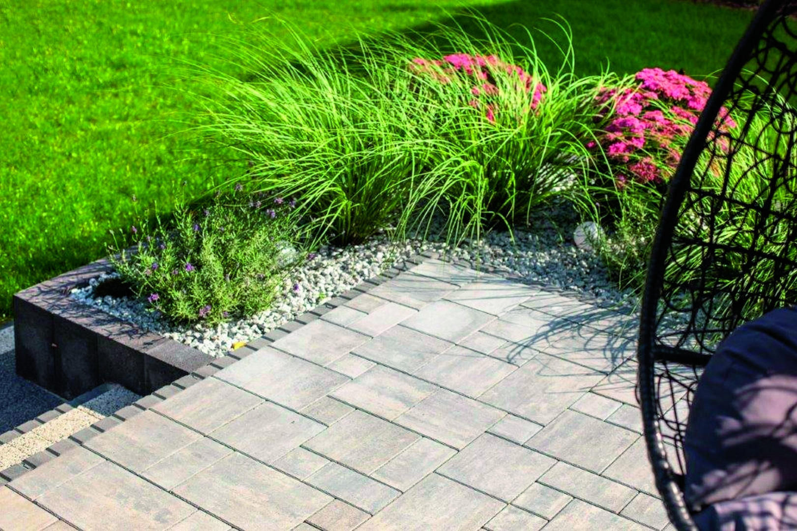 Duży wybór formatów płyt i kostek to kolejna możliwość różnicowania stref i dopasowania nawierzchni do stylu budynku. Na przykład kostki długie, ale wąskie używane są często w nowoczesnych aranżacjach i układane naprzemiennie - zwykle nie stosuje się więcej niż jednego odcienia, żeby nie burzyć minimalistycznego charakteru przestrzeni. Zazwyczaj układa się je dłuższym bokiem do osoby przemieszczającej się po alejce. Jeśli jednak zależy nam na stworzeniu ciekawej iluzji i optycznym wydłużeniu perspektywy, to warto ustawić je krótszym bokiem do osób wchodzących na ścieżkę. Poza klasycznym rozwiązaniem modne jest również układanie kostek w jodełkę. Wzór ten jest bardzo popularny na podłogach nowoczesnych salonów, dlatego naturalne stało się jego przedłużenie na przydomowy taras.
