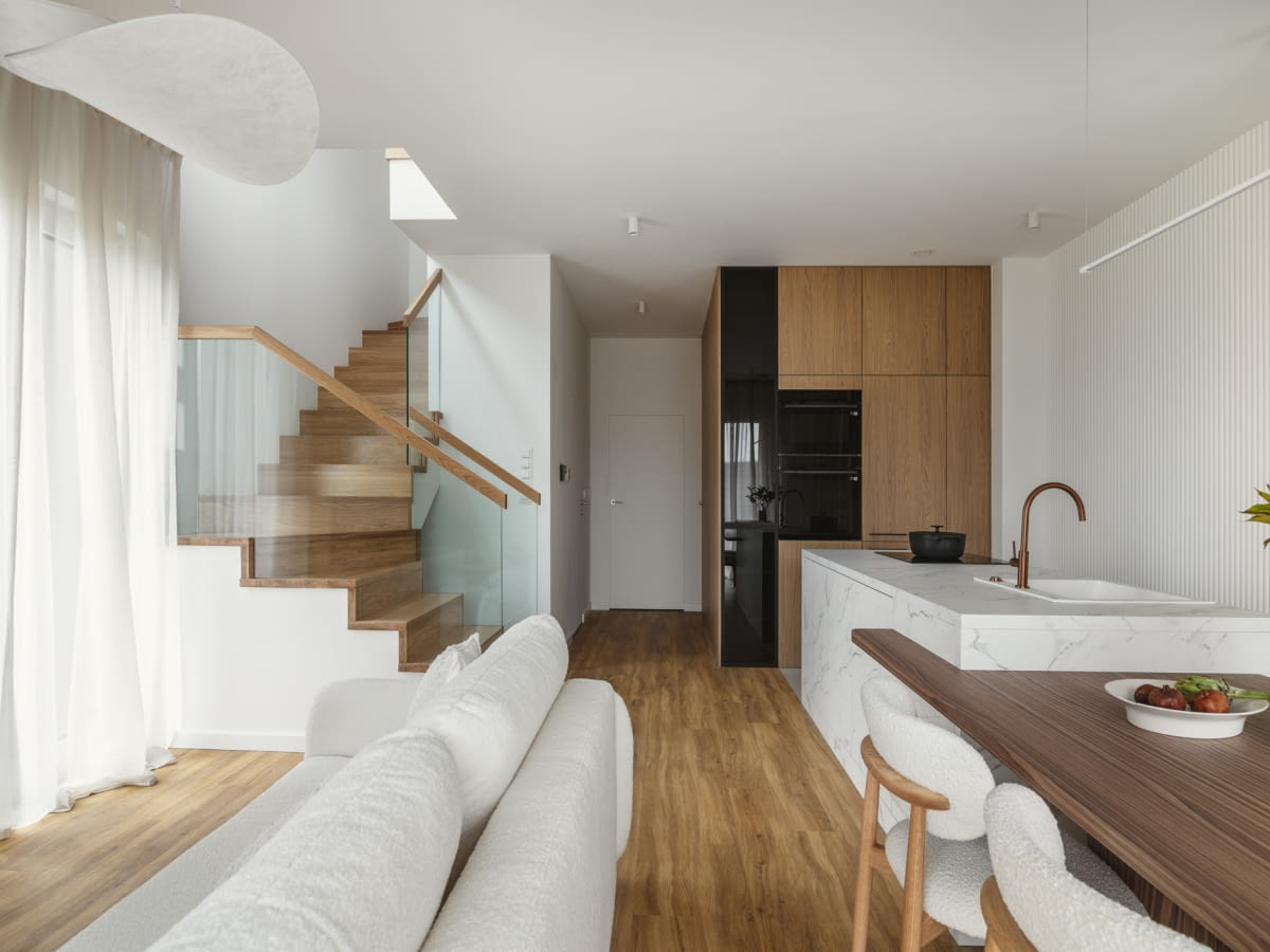 Jak podkreśla Agnieszka Zaranek, współautorka projektu, punktem wyjścia była minimalistyczna baza oraz spokojna paleta barw. Pozwoliły one zbudować wnętrze w duchu modern organic i japandi, opierając się na naturalnym drewnie, wyważonych formach oraz miękkich, przyjemnych w dotyku tkaninach. Istotną rolę odgrywają tu także meble wykonywane na wymiar w stolarni Decoroom, precyzyjnie dopasowane do funkcji i charakteru poszczególnych pomieszczeń, co podkreśla szlachetną prostotę i spójność całej aranżacji.