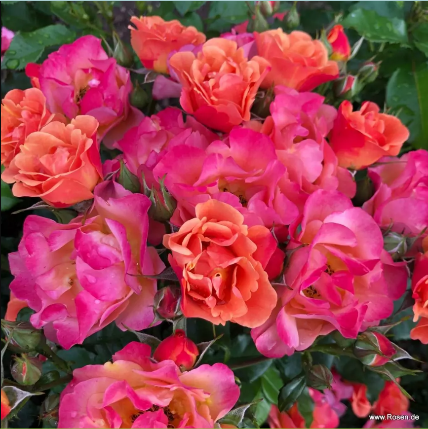 Róża ‘Spicy®’. Wyprostowana, krzaczasta róża rabatowa z obfitymi baldachami, których lekko pełne kwiaty zmieniają barwę z pomarańczowej na różową, tworząc w ten sposób żywą grę kolorów. Doskonałą zdrowotność liści potwierdza wyróżnienie ADR® 2024. Uzupełnienie kolekcji Fantasia® o odmiany o niezwykłych barwach kwiatów.Fot. Szkółka RosaĆwik