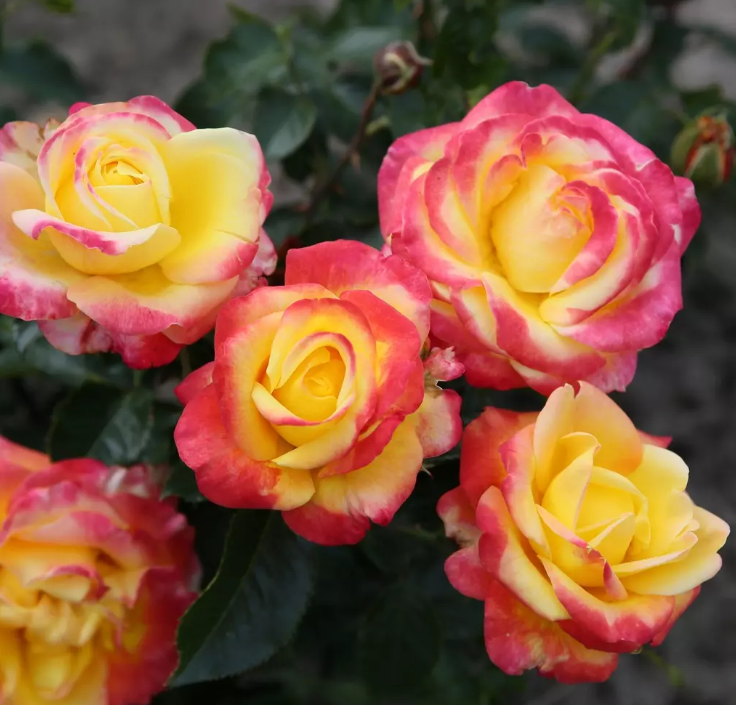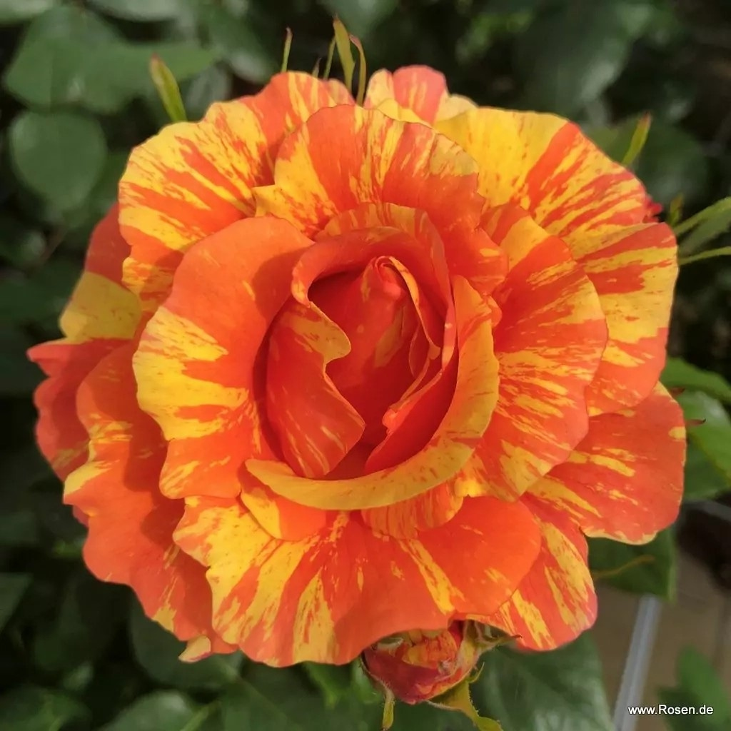 Róża 'Lollipop®’. Zwarta, krzaczasta róża rabatowa o wys. 60 cm o półpełnych kwiatach w świeżej, owocowej kombinacji kolorów żółto-pomarańczowych. Pomimo nietypowego wyglądu jest to róża łatwa w pielęgnacji i o zdrowych liściach.Fot. Szkółka RosaĆwik