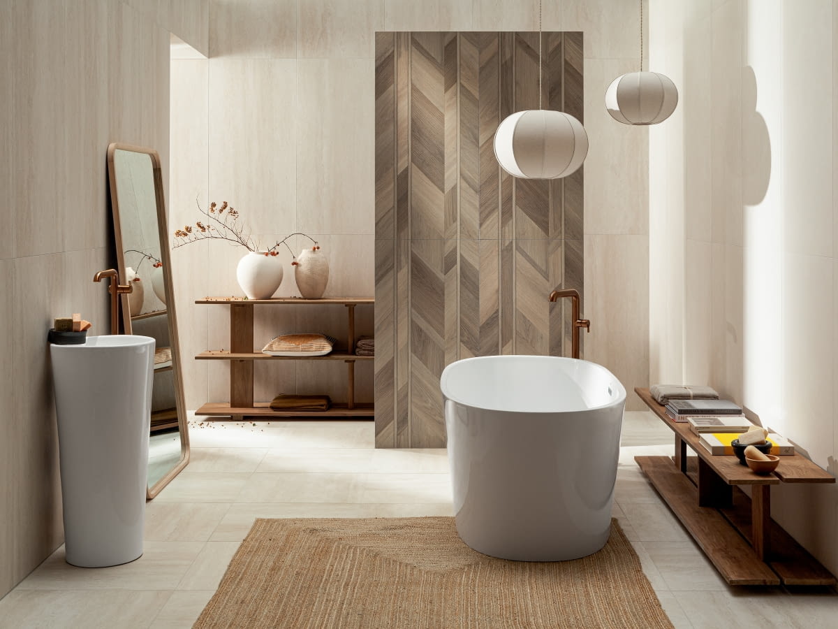 Kolekcja Echo dobrze komponuje się z płytkami inspirowanymi drewnem. Zestawienie mineralnej struktury kamienia z wizualną miękkością rysunku drewna pozwala tworzyć aranżacje o ponadczasowym charakterze, łączące estetykę naturalnych materiałów z nowoczesną funkcjonalnością. Propozycja ta odpowiada zarówno zwolennikom minimalistycznych realizacji, jak i osobom preferującym klasyczne rozwiązania.