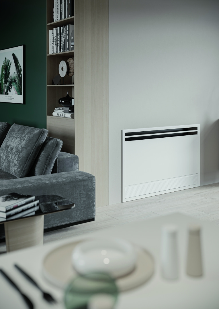 - Wykorzystanie instalacji zarówno do ogrzewania, jak i chłodzenia pomieszczeń. Część inwestorów dąży do tego, aby instalacja w budynku nie tylko zapewniała komfortowe ogrzewanie w sezonie zimowym, ale również umożliwiała skuteczne chłodzenie pomieszczeń w okresie letnim. W takim przypadku stosuje się pompę ciepła współpracującą z instalacją podłogową, ścienną lub sufitową, która w trybie letnim może pełnić funkcję systemu chłodzącego. Jeżeli celem jest uzyskanie wyższego komfortu i większej swobody w regulacji temperatury w poszczególnych pomieszczeniach, inwestorzy decydują się na montaż klimakonwektorów. Urządzenia te, przypominające wyglądem grzejnik lub ścienny klimatyzator, wyposażone są w wymiennik, przez który przepływa woda z pompy ciepła, oraz wentylator wymuszający intensywny ruch powietrza.
