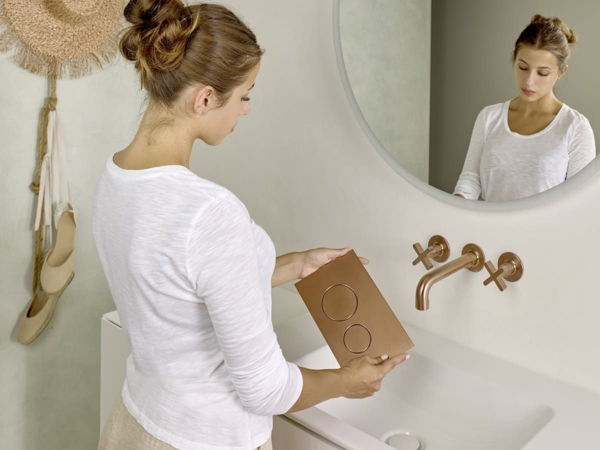 Wykończenie przycisków spłukujących Geberit Sigma40 oraz sterowań pisuarowych typ 40 można teraz indywidualnie dopasować do stylistyki i materiałów baterii umywalkowych, wannowych i prysznicowych wielu producentów. Dzięki temu architekci zyskują większą swobodę w projektowaniu spójnych, dopracowanych wnętrz, w których każdy detal współgra z całością.