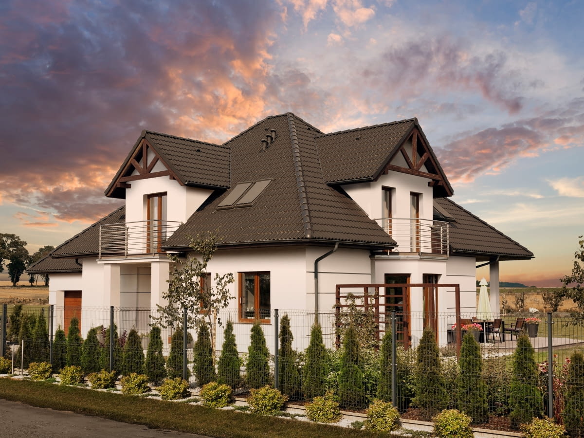 Z kolei Bałtycka i Celtycka to betonowe dachówki o bardziej dekoracyjnym profilu, przypominającym łagodną falę. Ich klasyczna forma i nieco bardziej masywna stylistyka sprawdzają się szczególnie dobrze w domach stylizowanych, parterowych i tych, w których dach stanowi silnie wyeksponowany element architektury. Oba modele występują w szerokiej gamie kolorów od ceglanych i brązowych po grafitowe i czarne, dostępne są w wersjach Cisar oraz nowoczesną powłoką TermoComfort.
